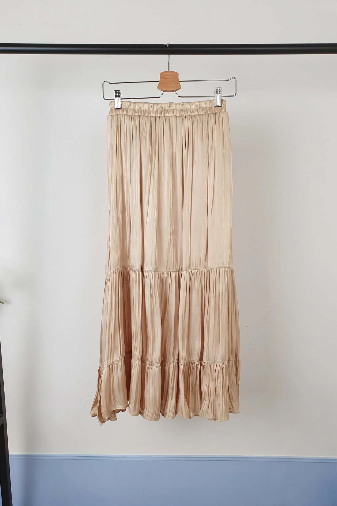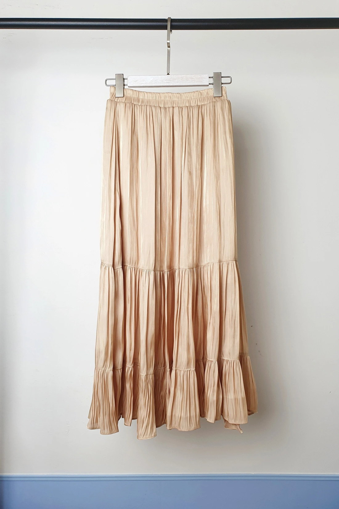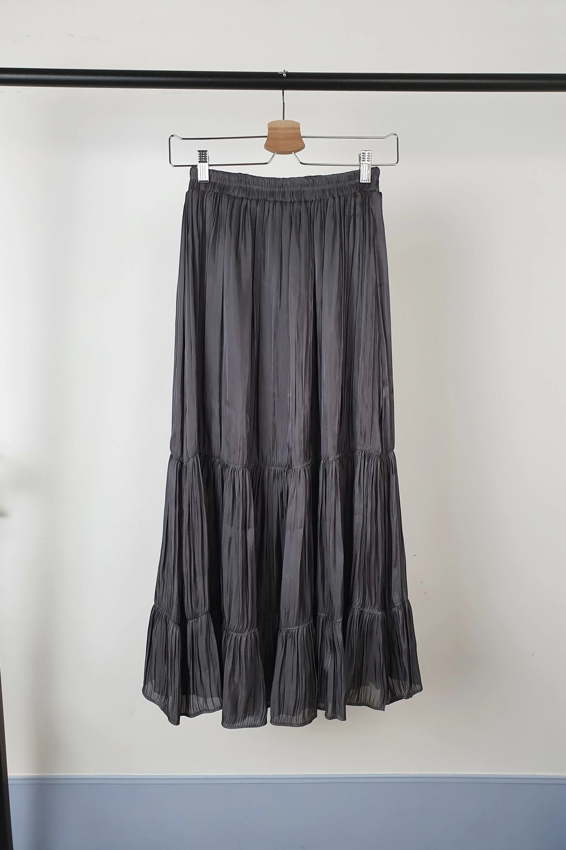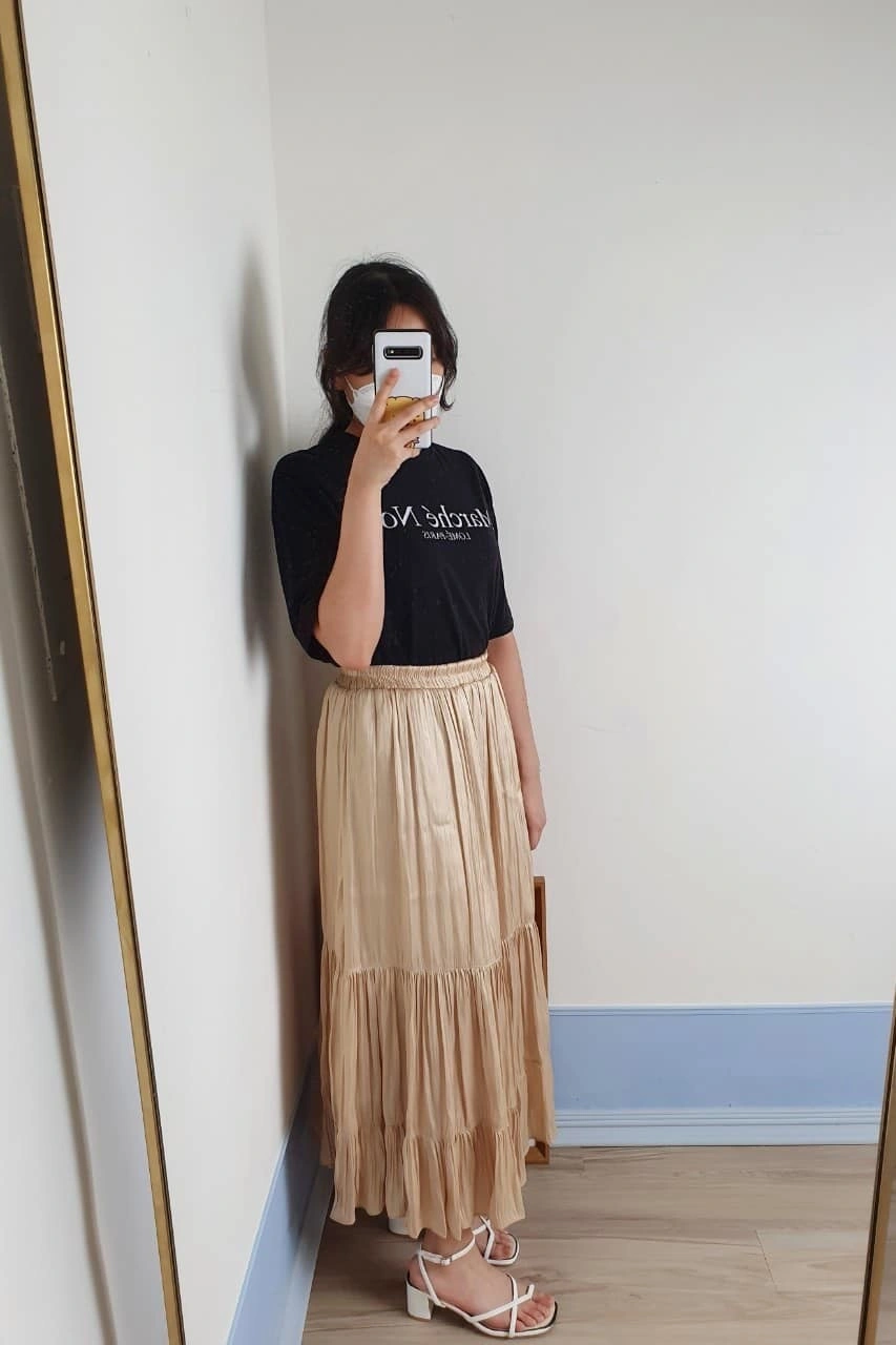 松緊腰設計/裙擺壓摺設計/布料微光澤柔滑感