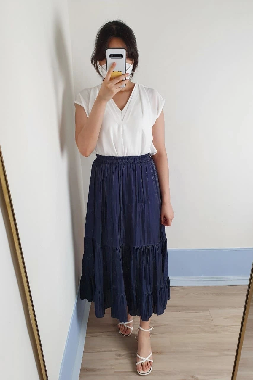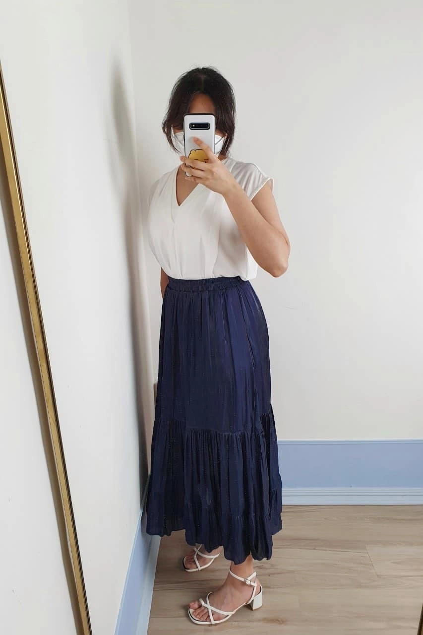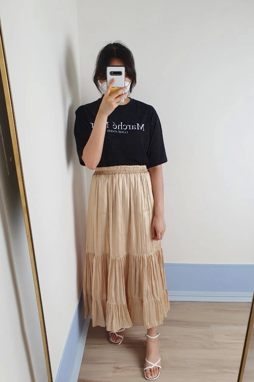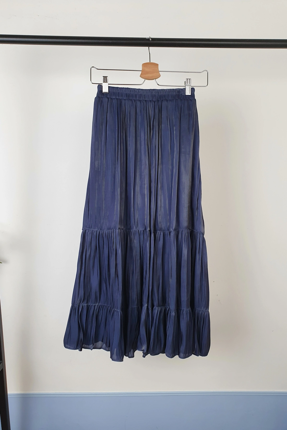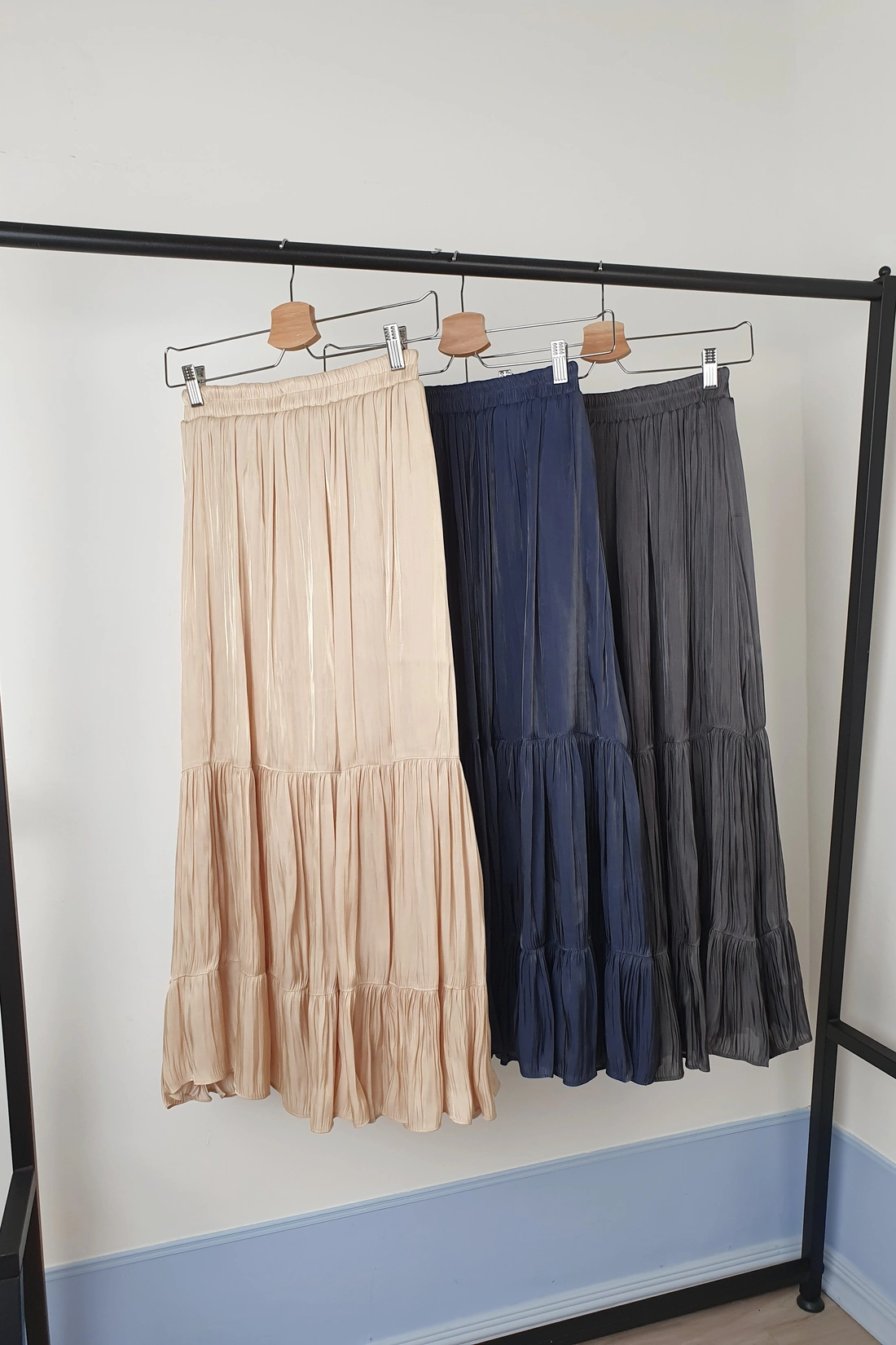 松緊腰設計/裙擺壓摺設計/布料微光澤柔滑感