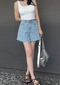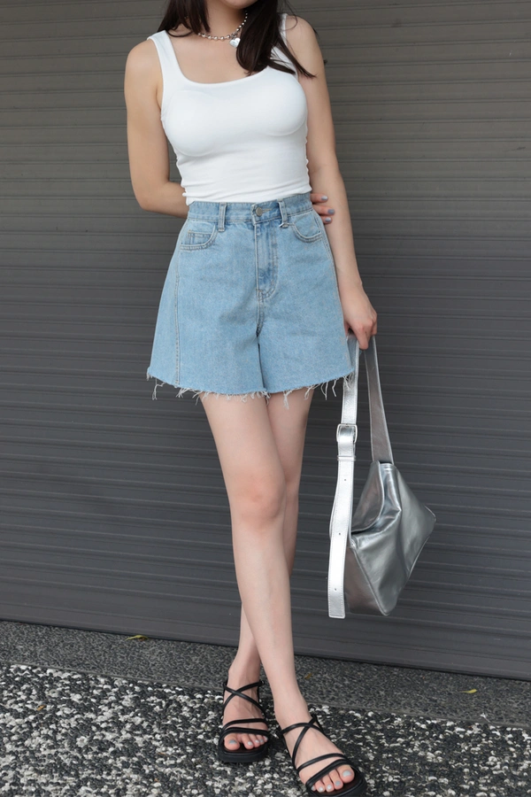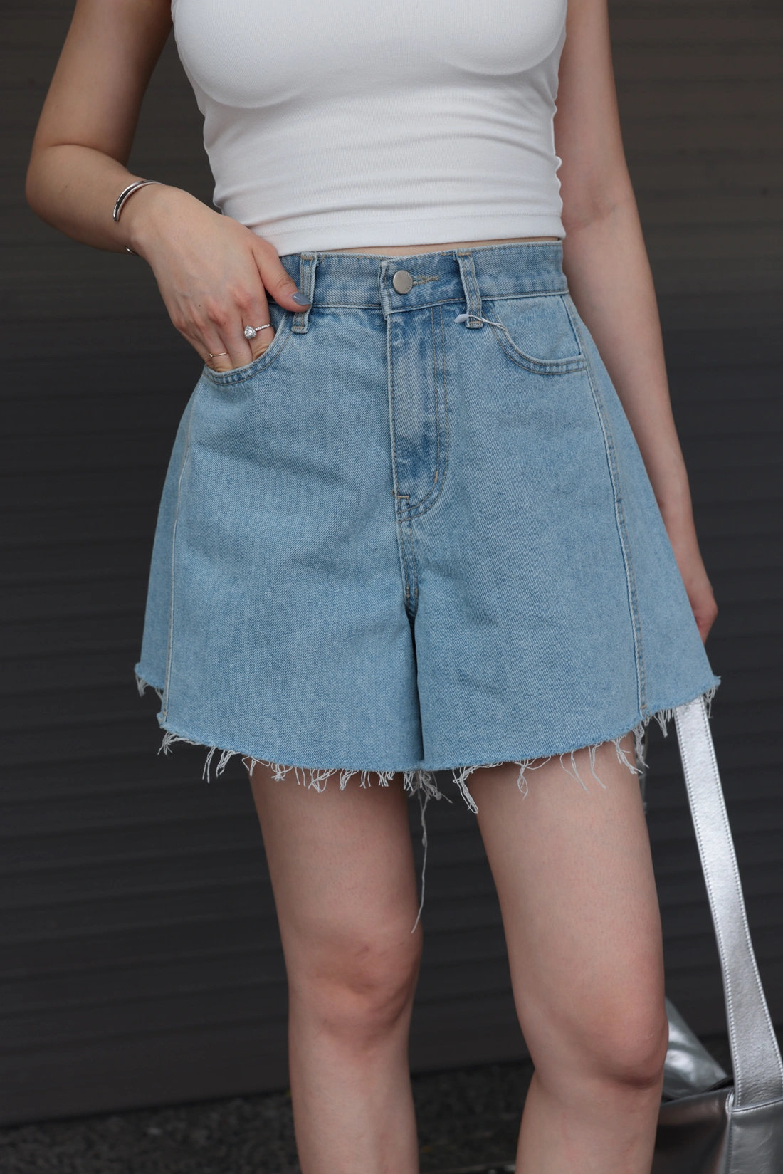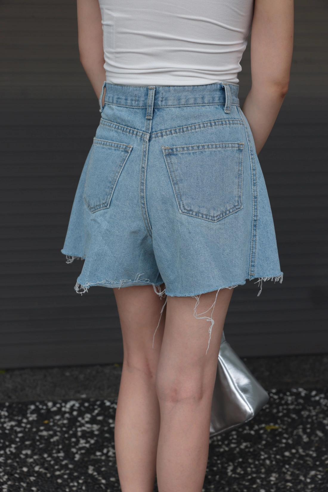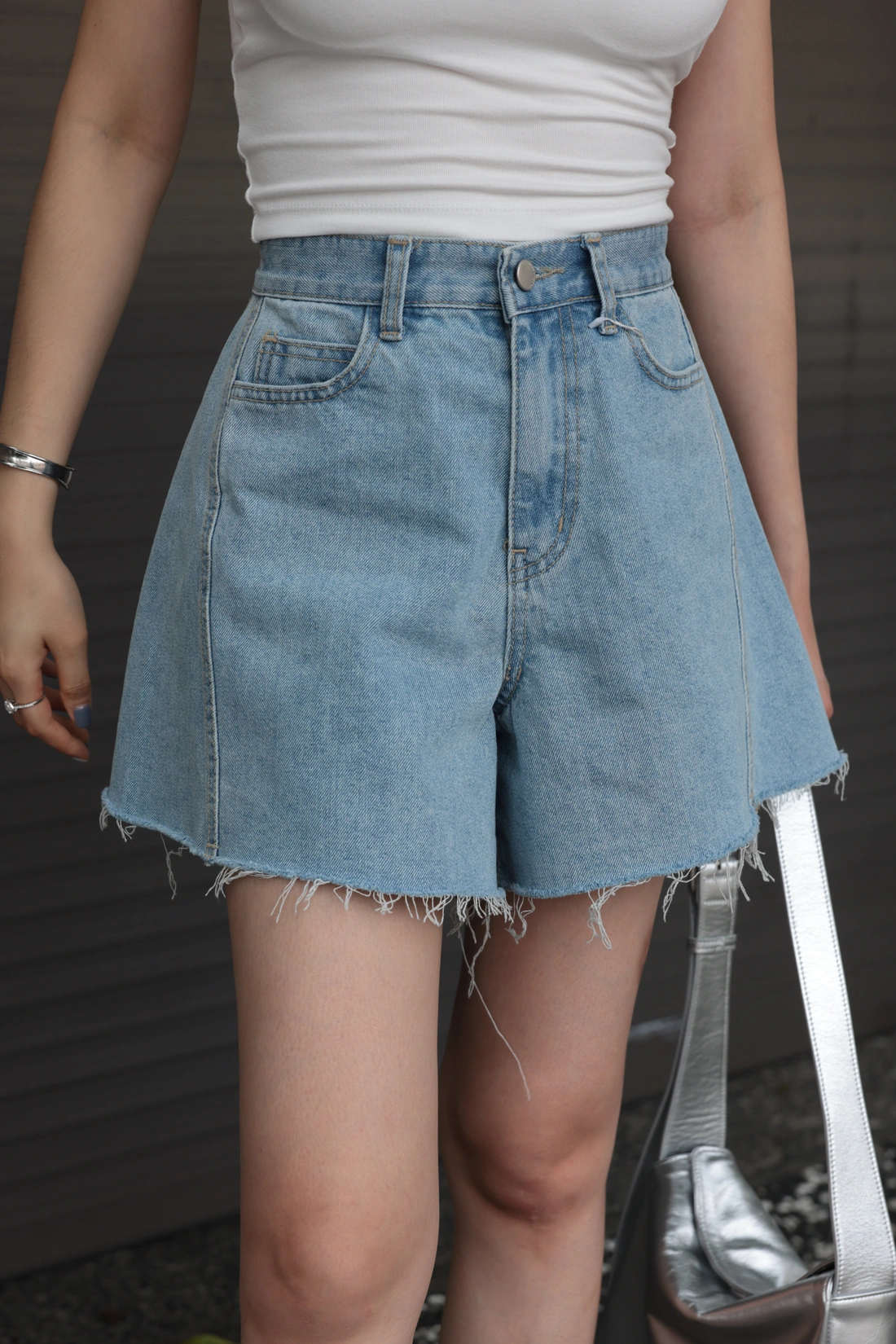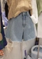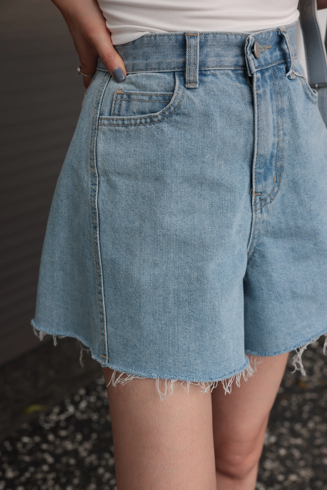 高腰拼接風牛仔短褲/毛邊抽鬚設計/休閒復古個性風
