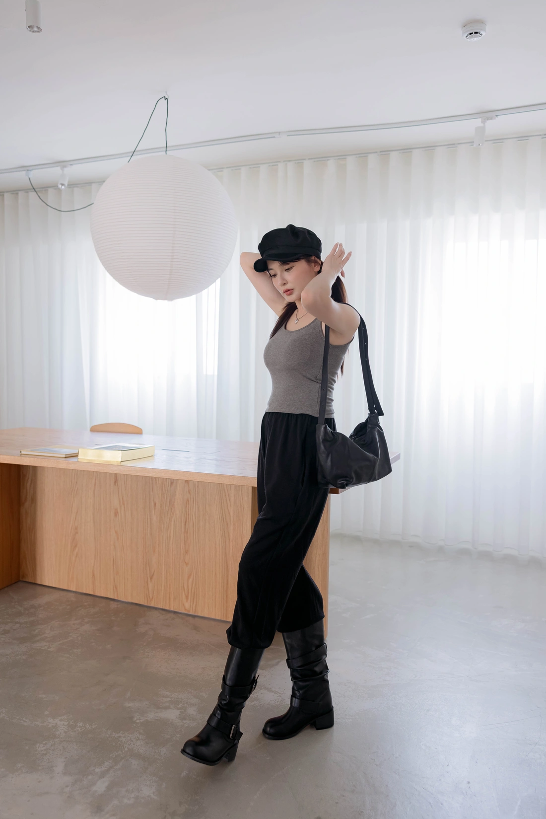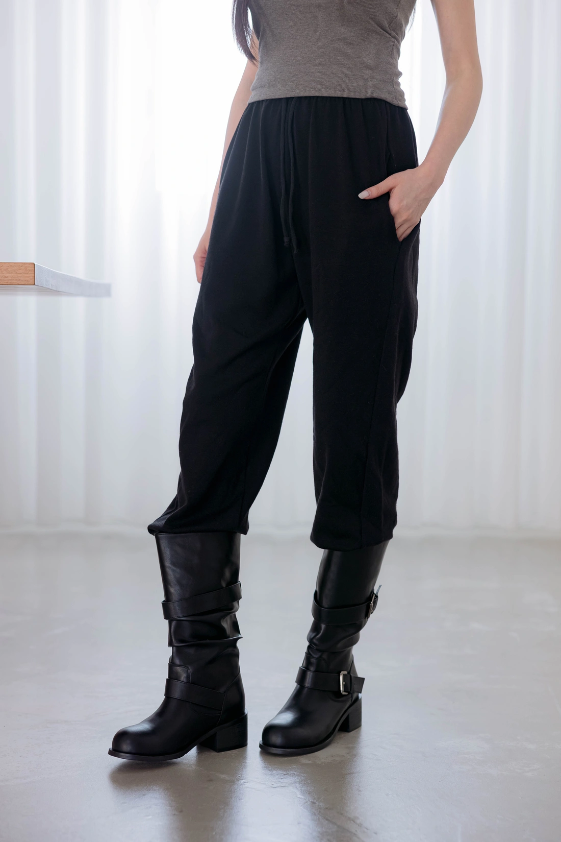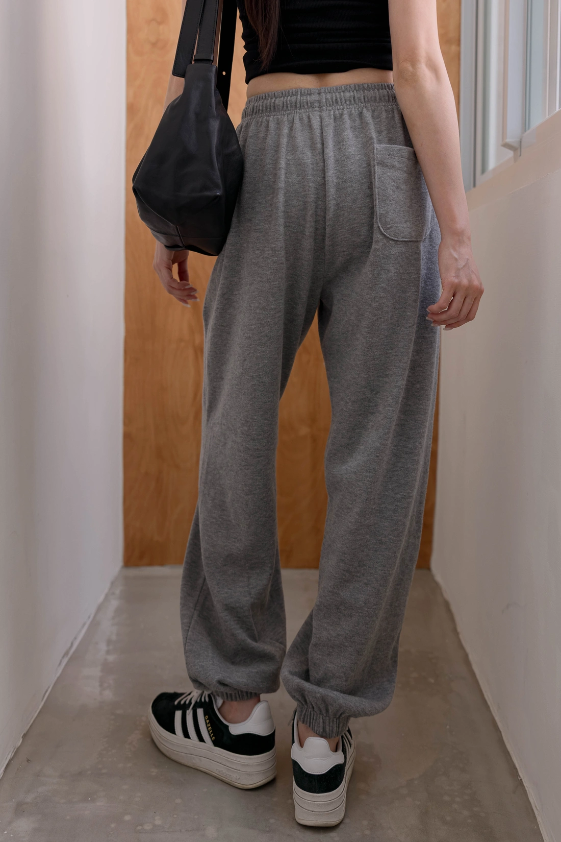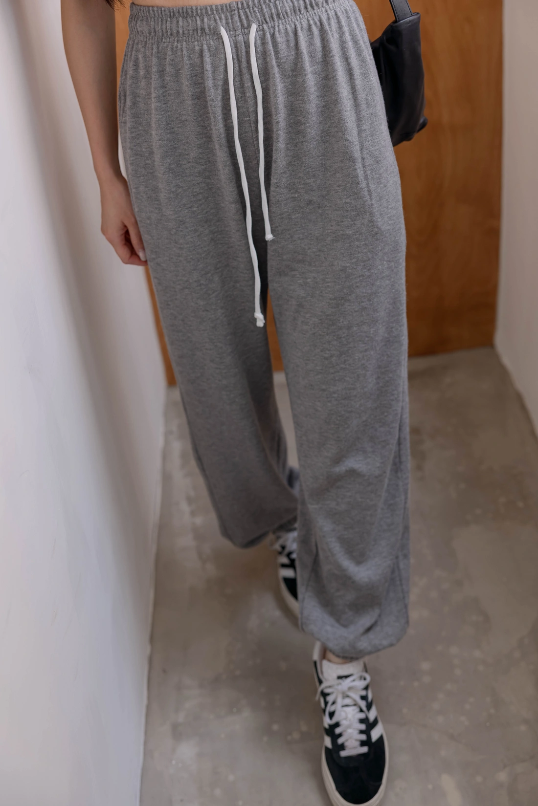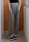 鬆緊腰設計毛料縮口褲/休閒綁帶設計/背面單口袋設計