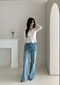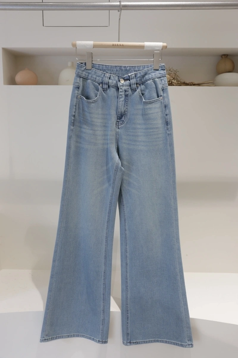 微寬喇叭褲型/大腿處貓抓紋刷白設計/腰圍無彈性