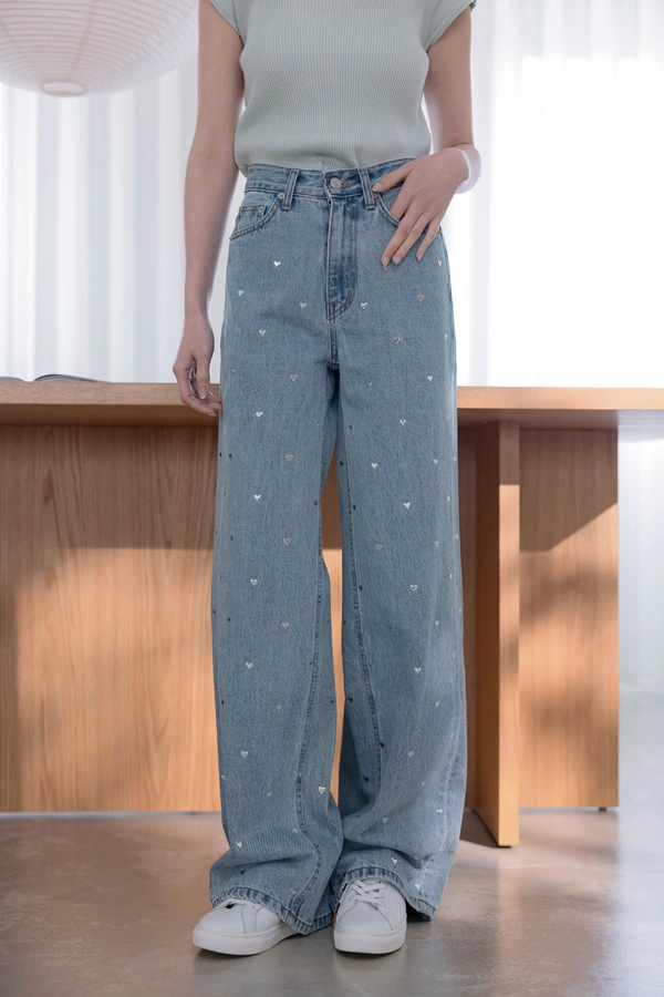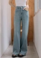 微寬喇叭褲型/大腿處貓抓紋刷白設計/腰圍無彈性