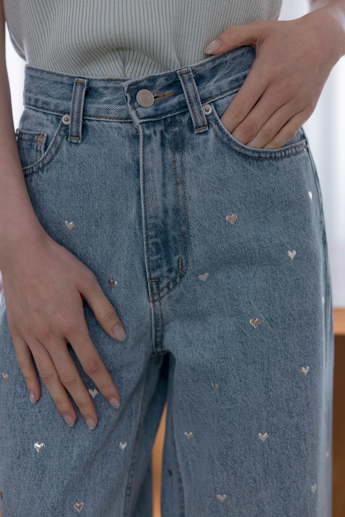 正面滿版愛心水鑽設計/偏硬挺牛仔布料