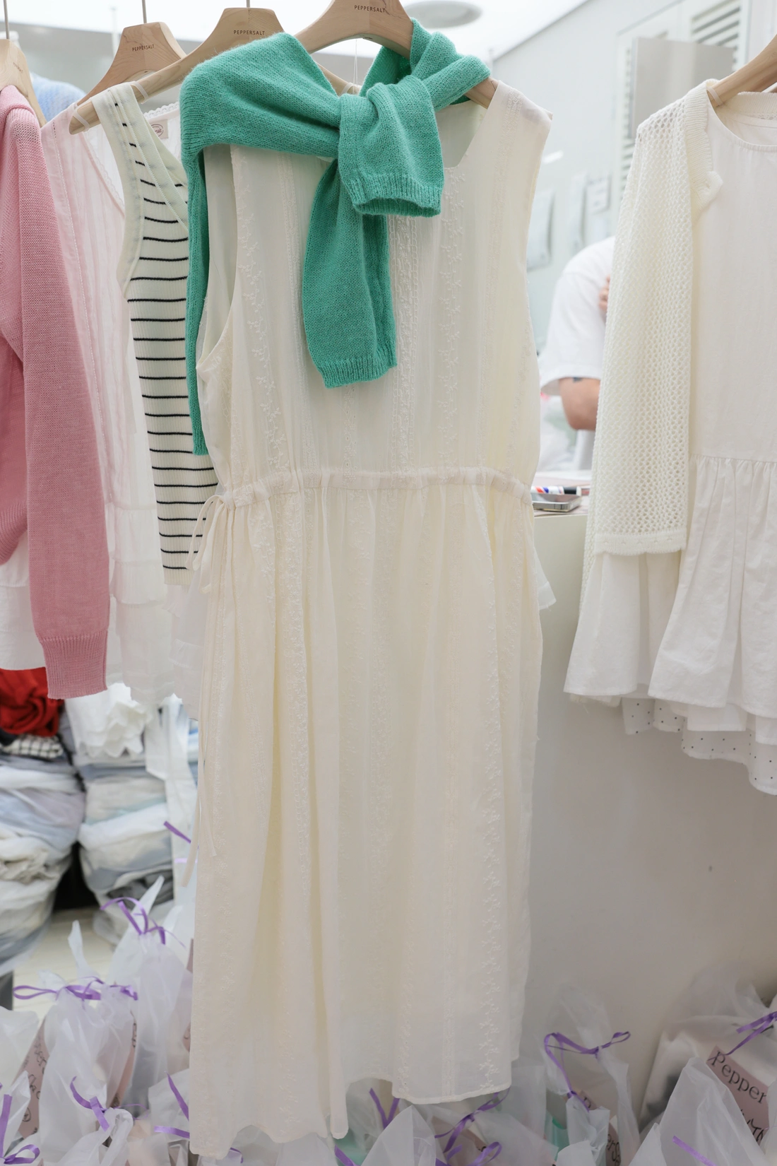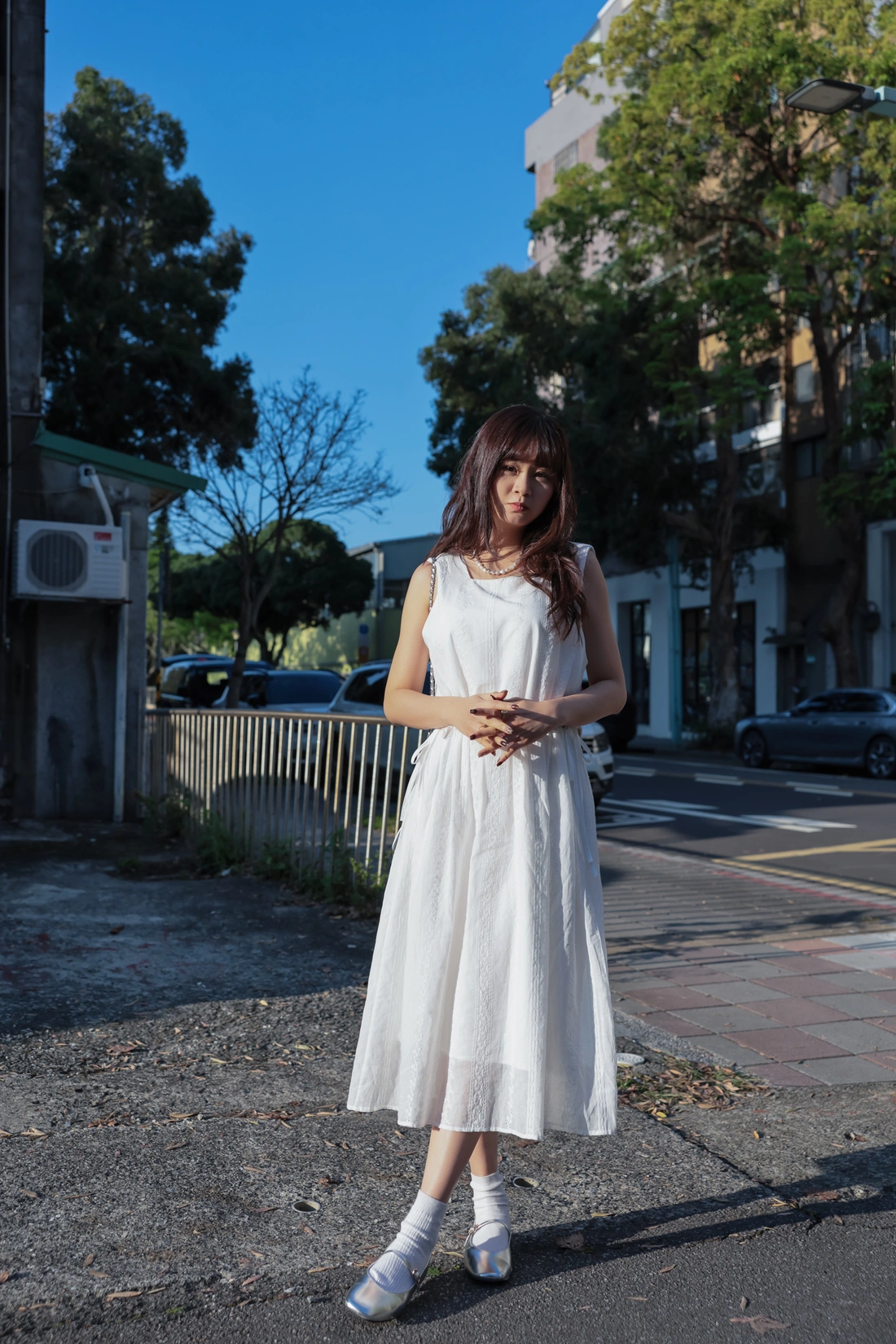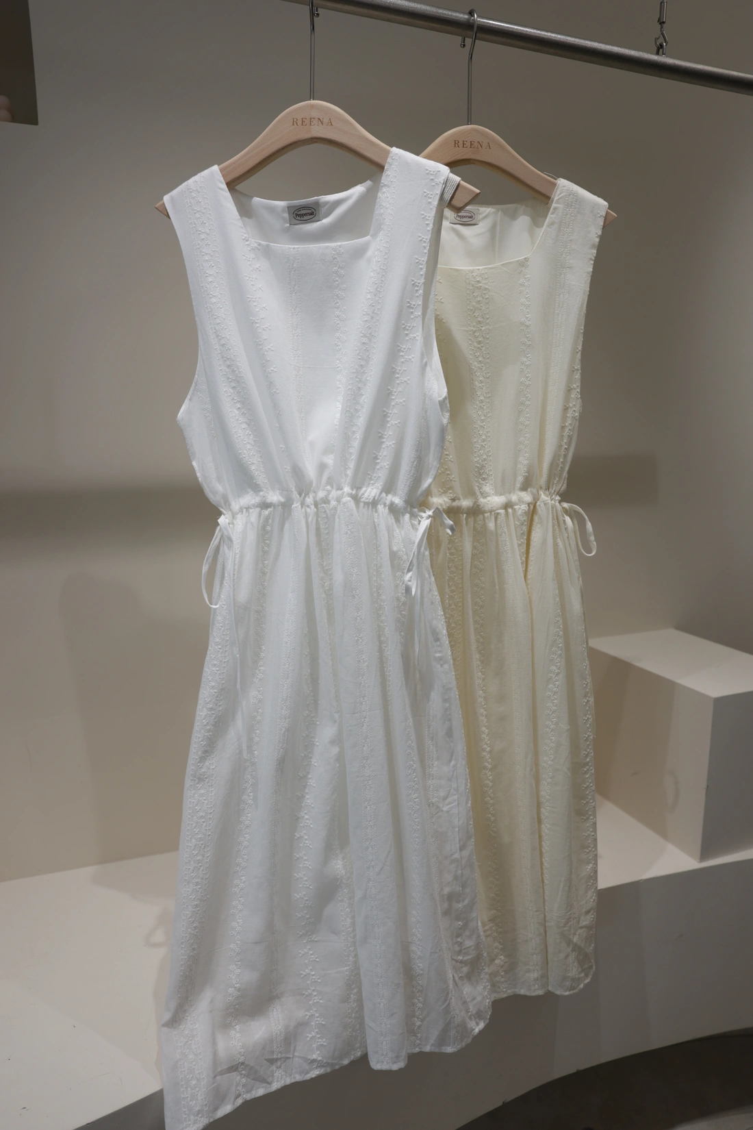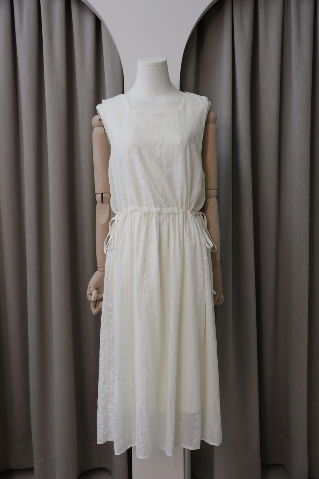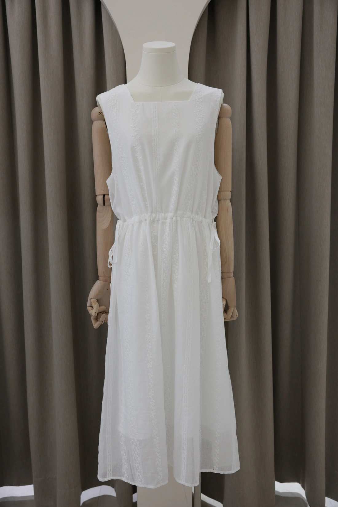 側邊縮腰綁結設計/無袖方領設計長洋/細節雕花設計洋裝
