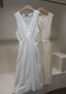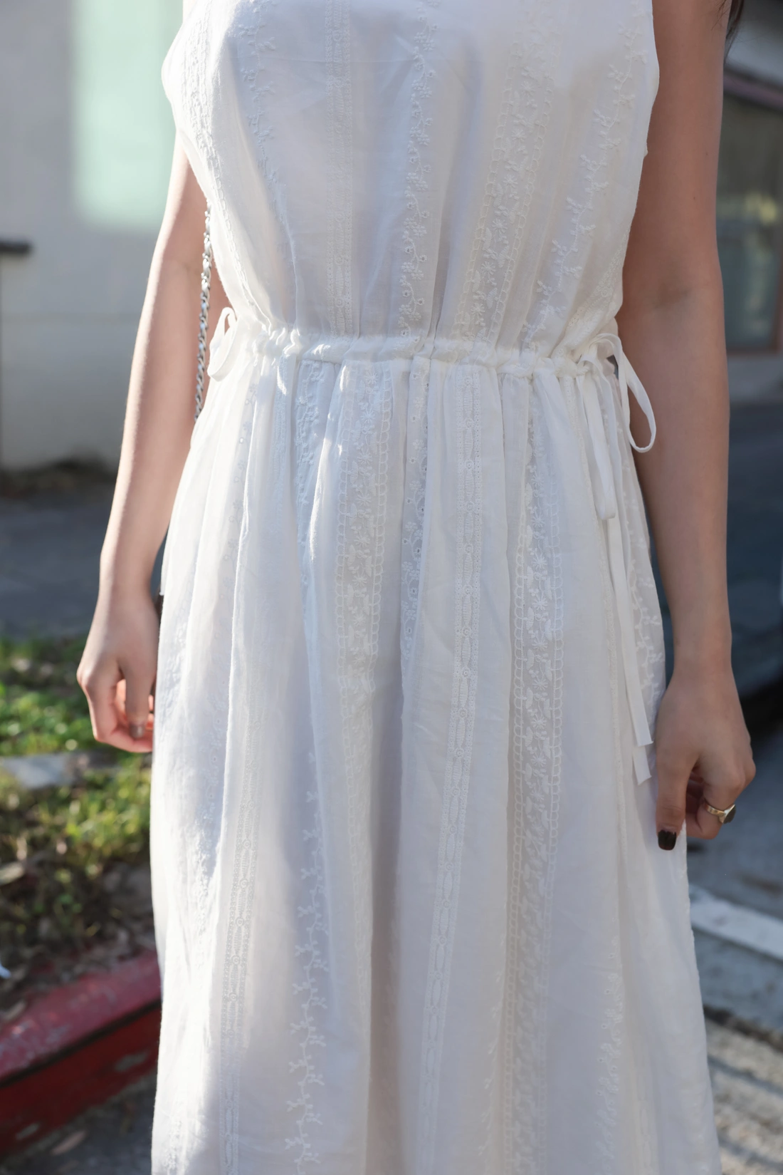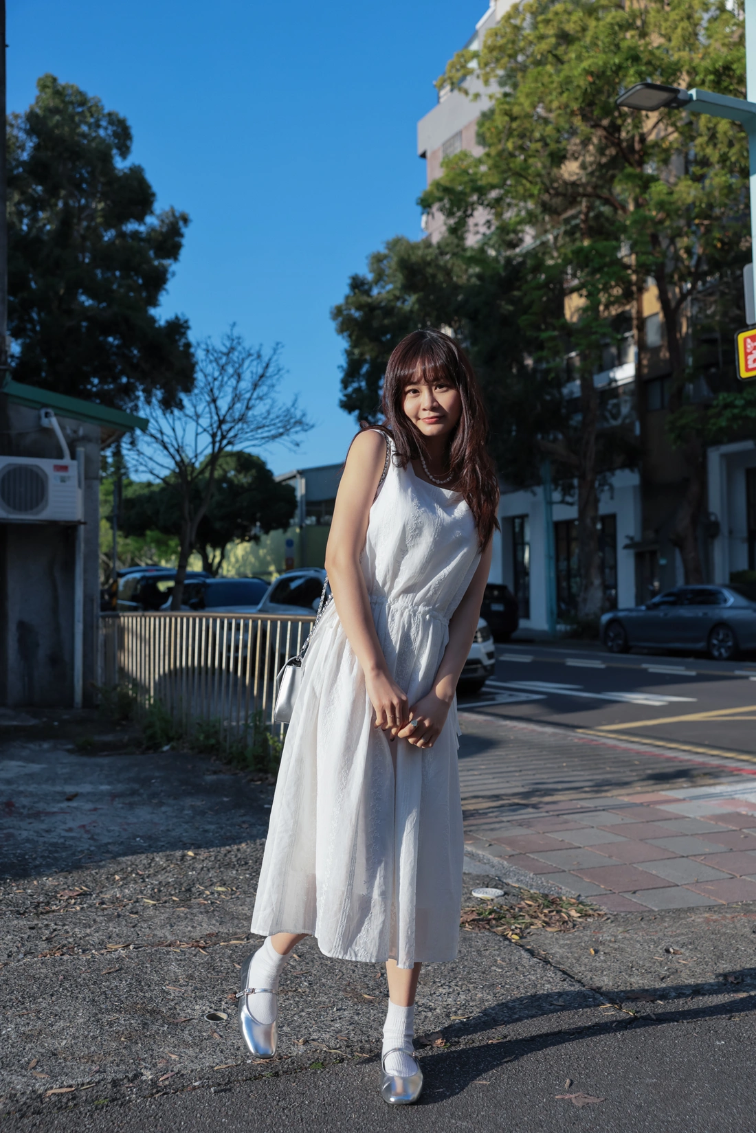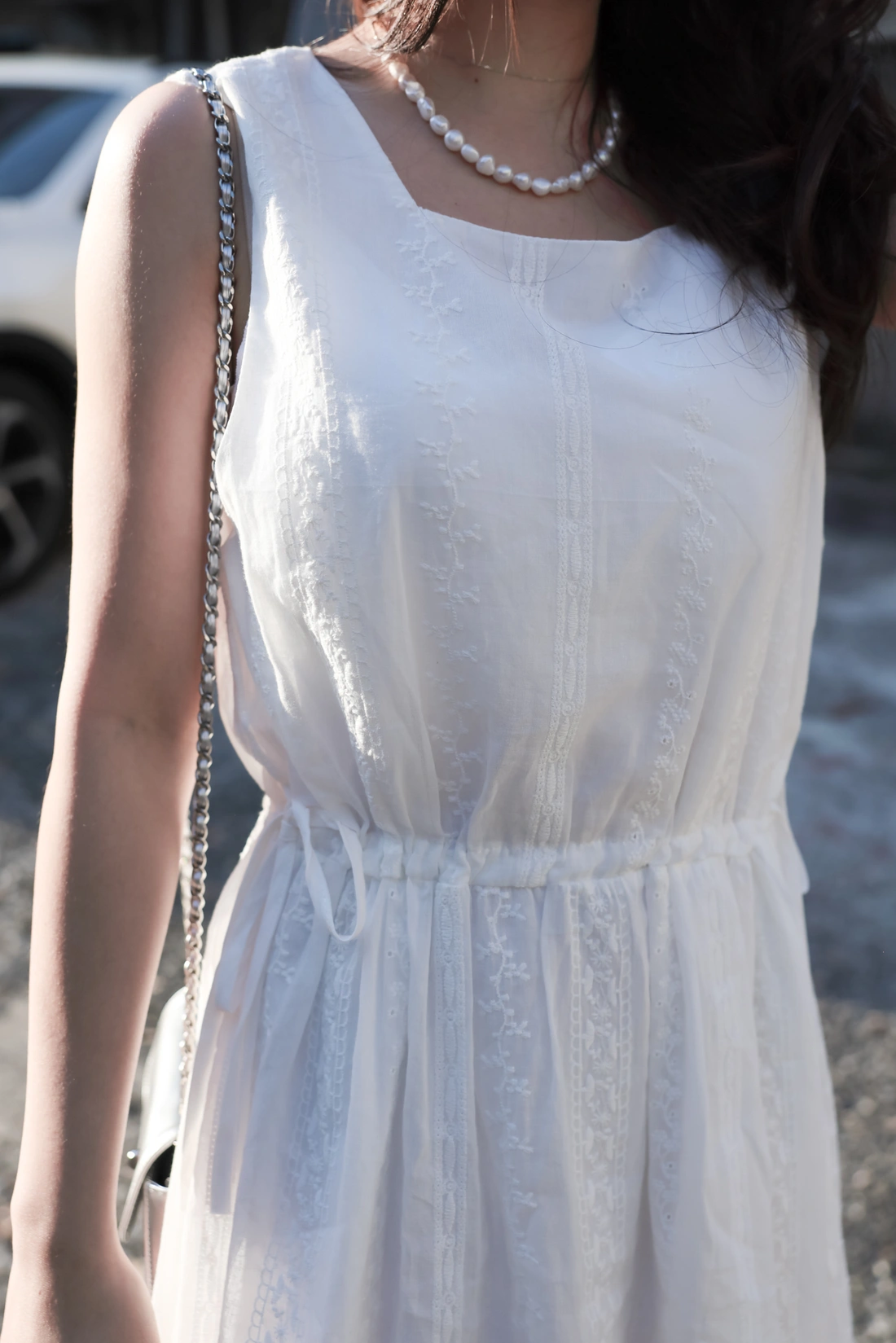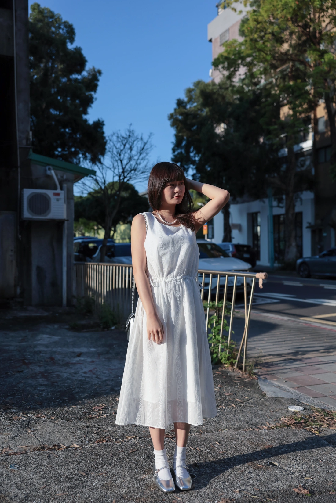 側邊縮腰綁結設計/無袖方領設計長洋/細節雕花設計洋裝