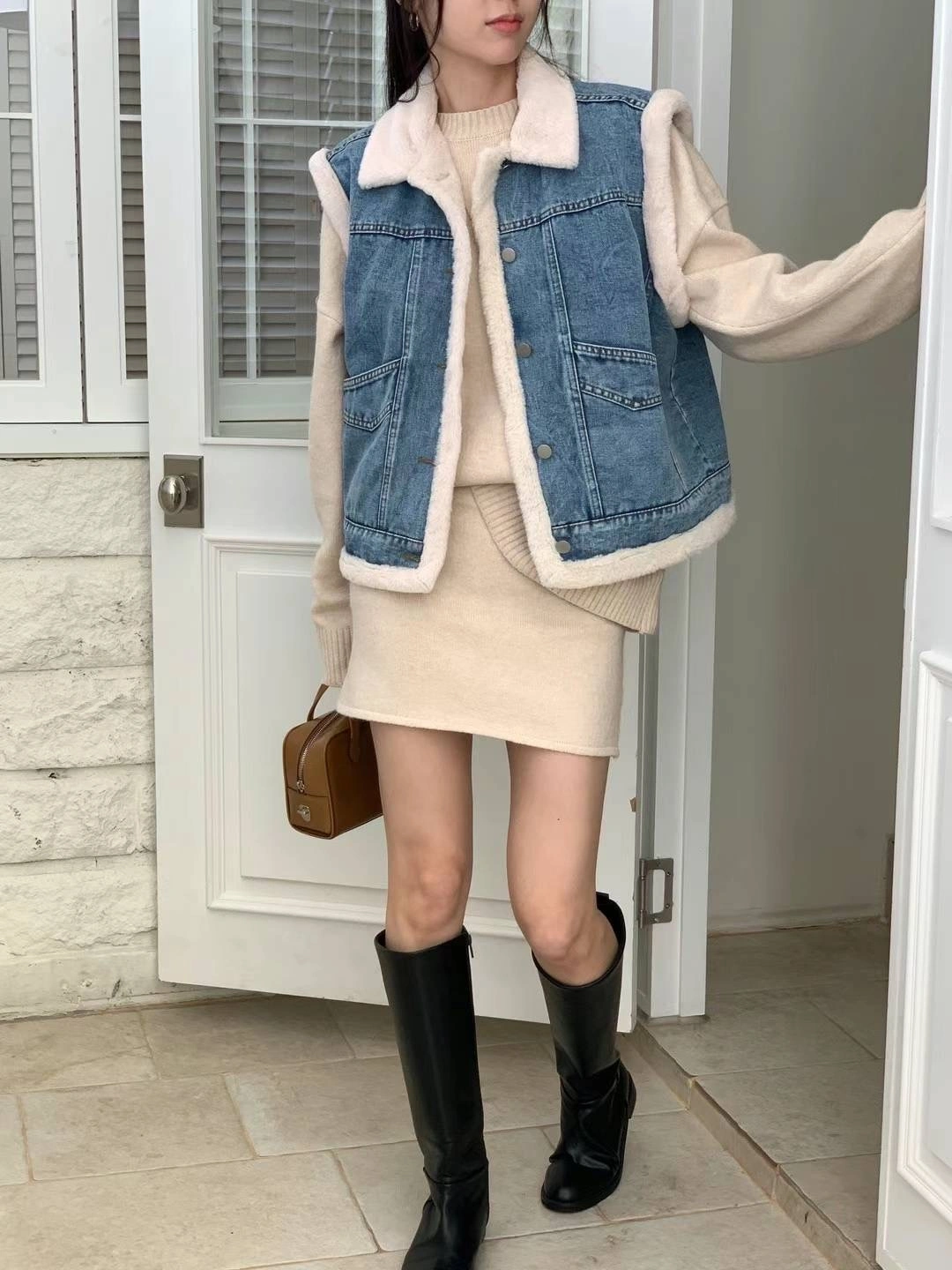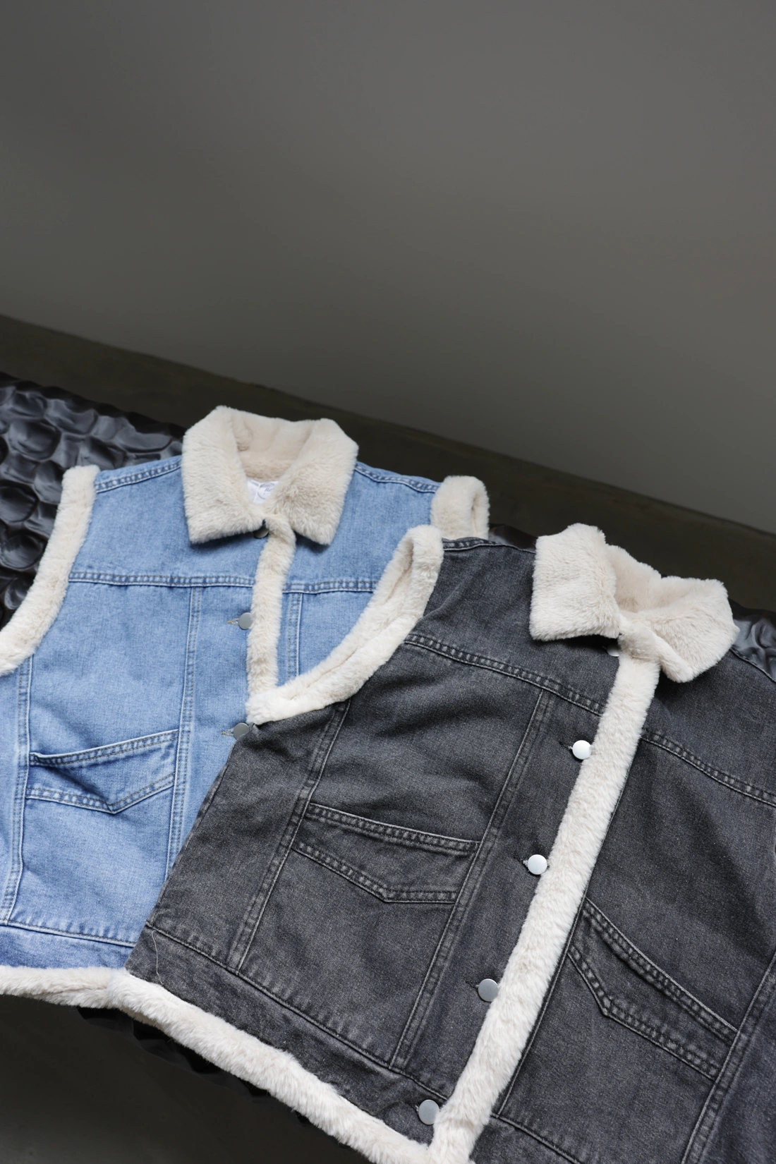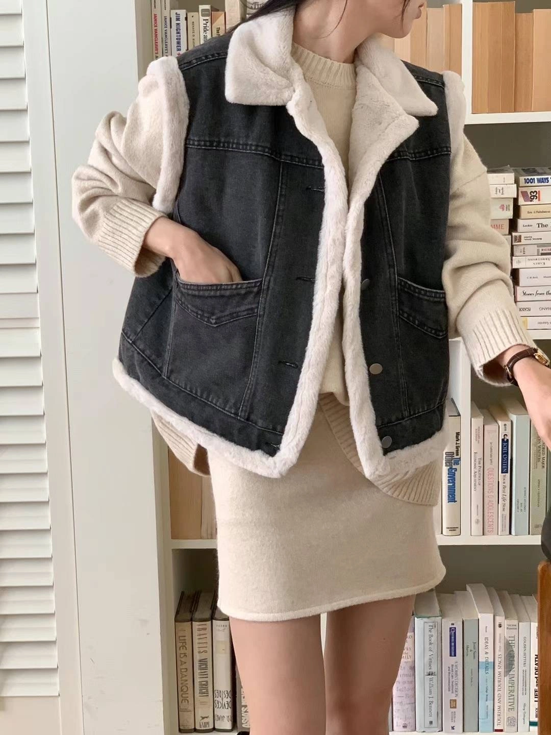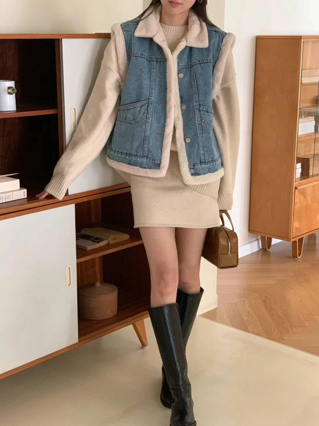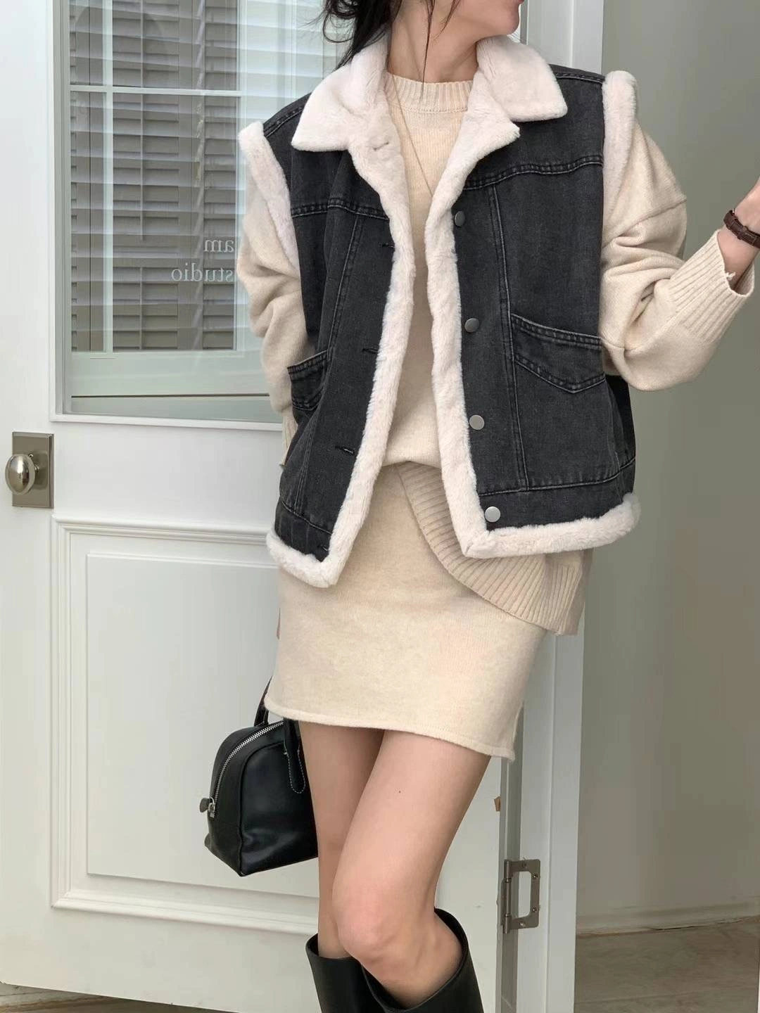 拼接設計牛仔外套/內裡全鋪絨毛設計感背心/前微斜口袋造型設計