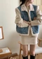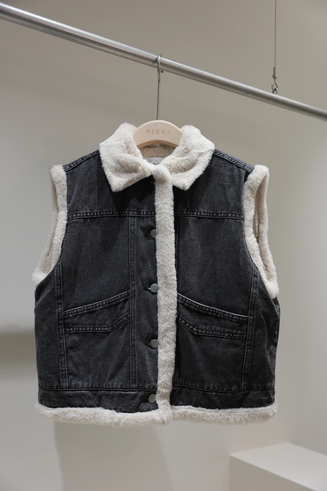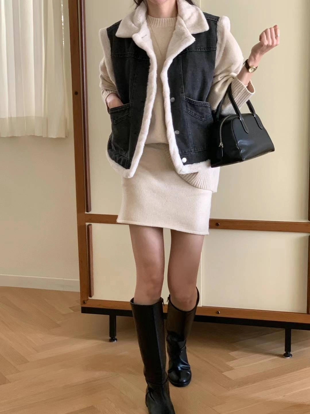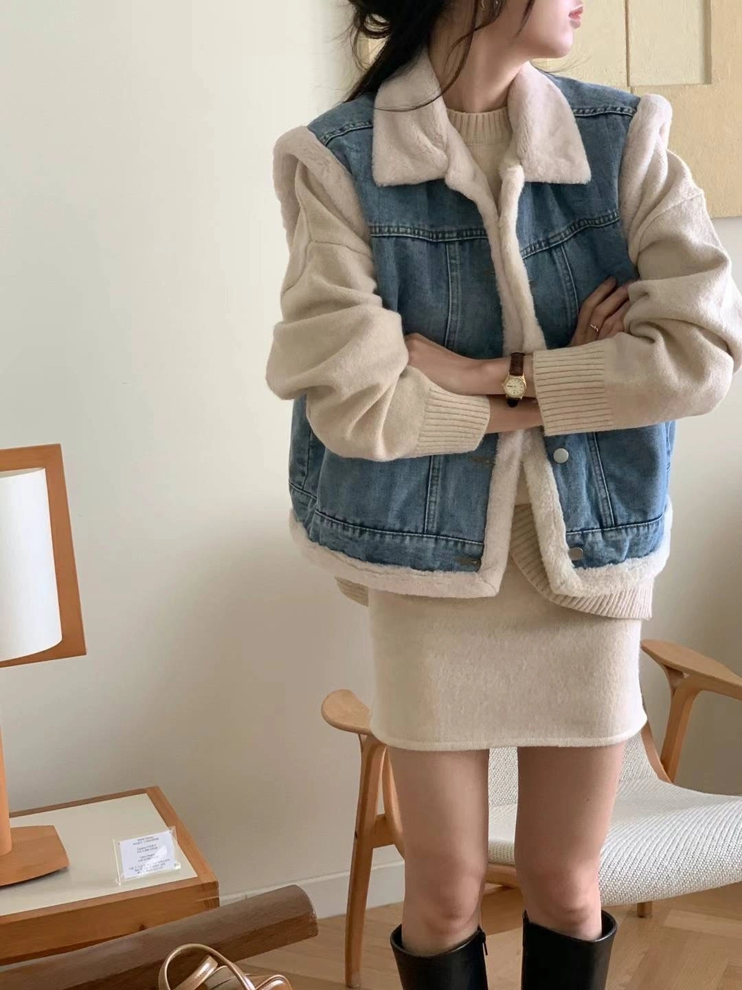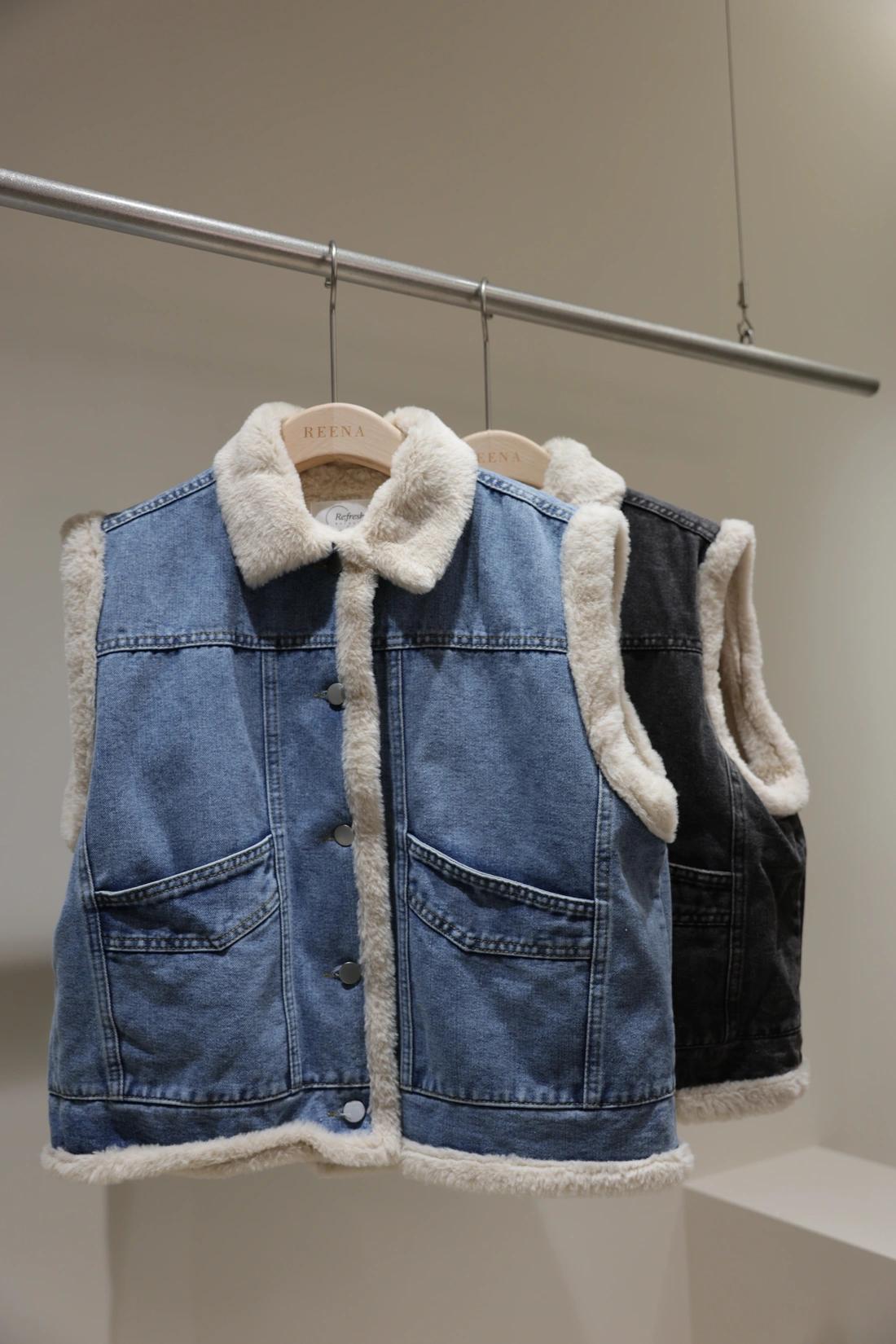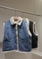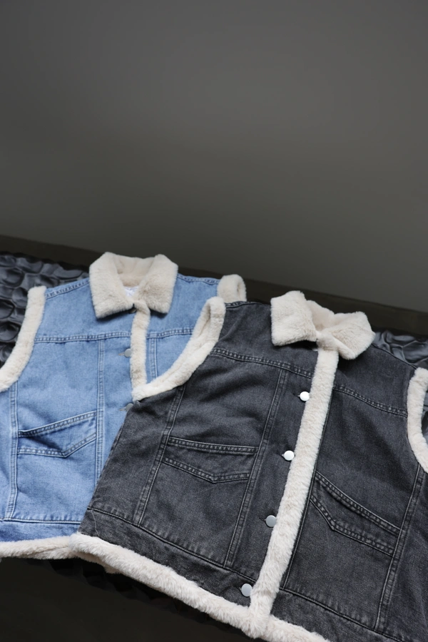 拼接設計牛仔外套/內裡全鋪絨毛設計感背心/前微斜口袋造型設計