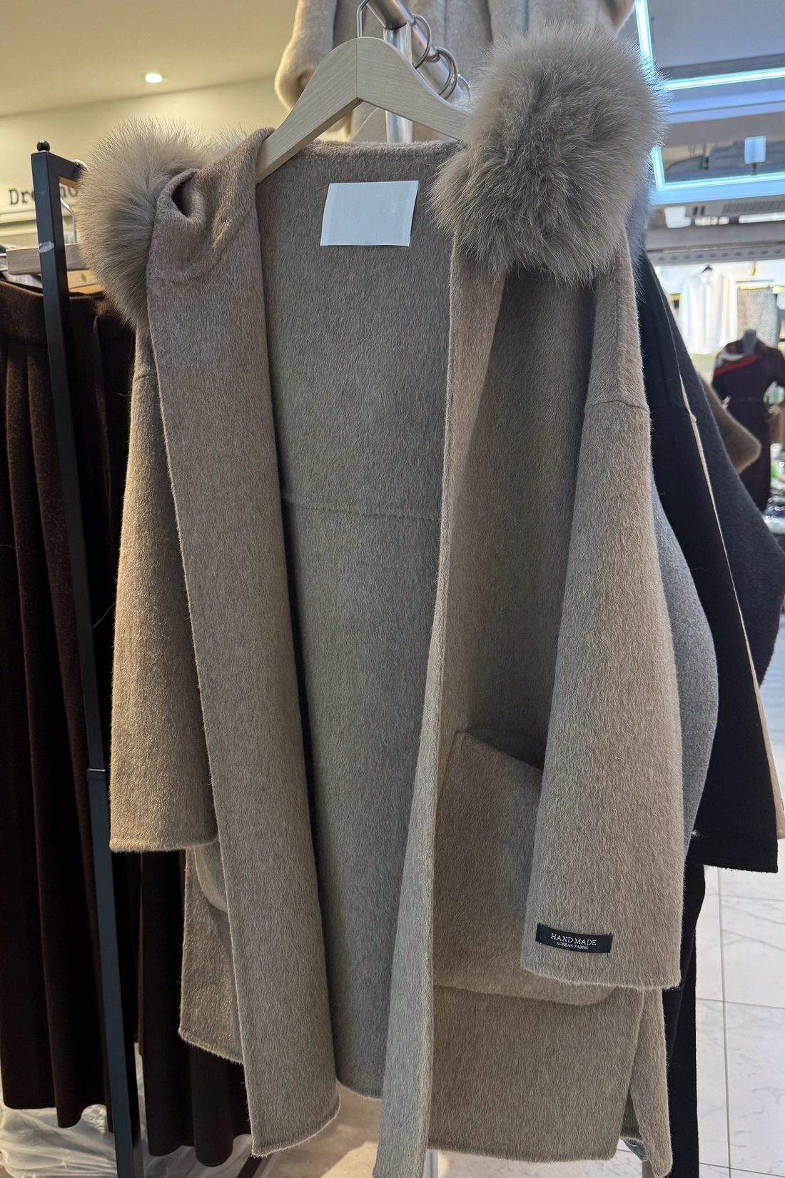 帽子狐狸毛可拆/下襬側開衩/附腰帶