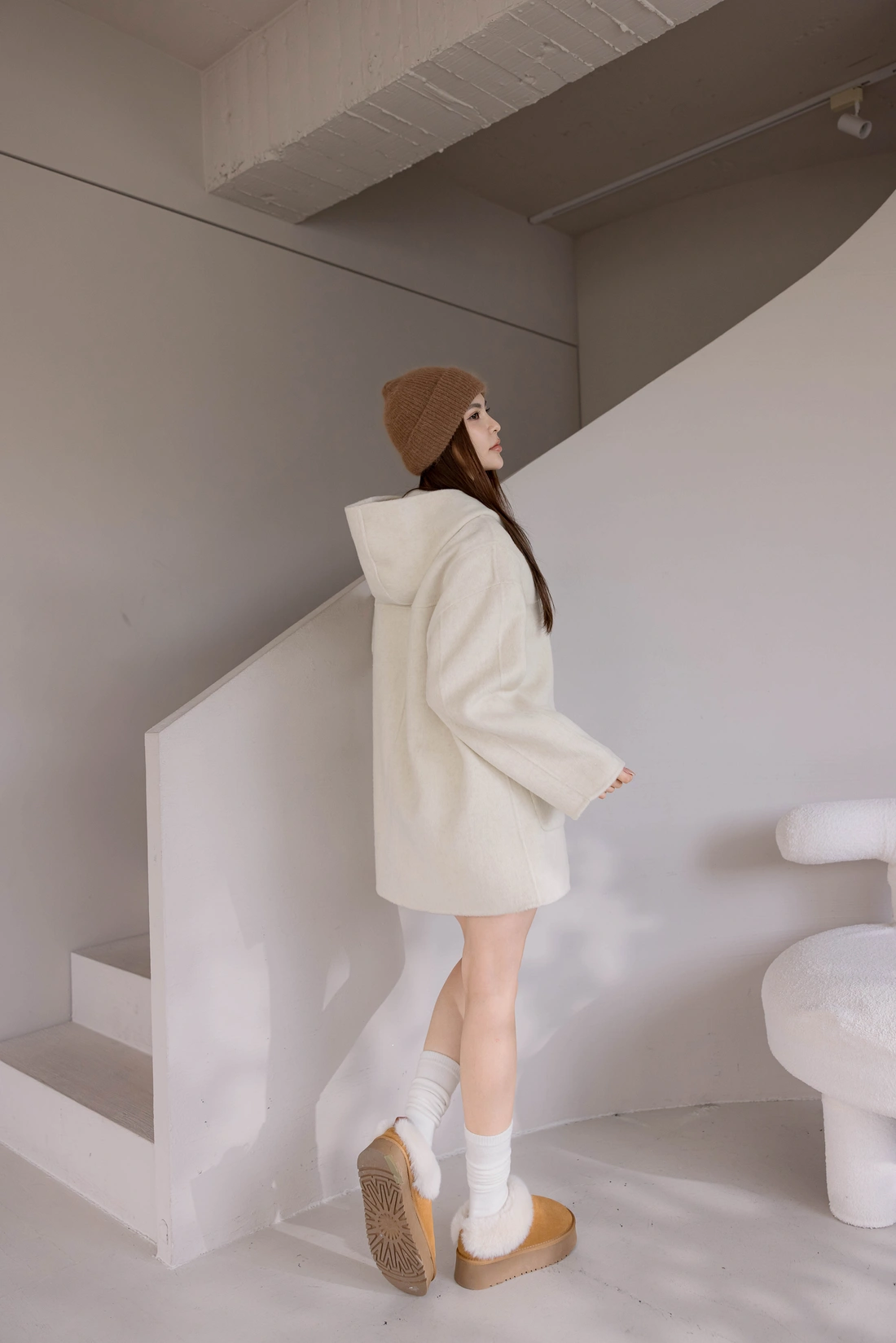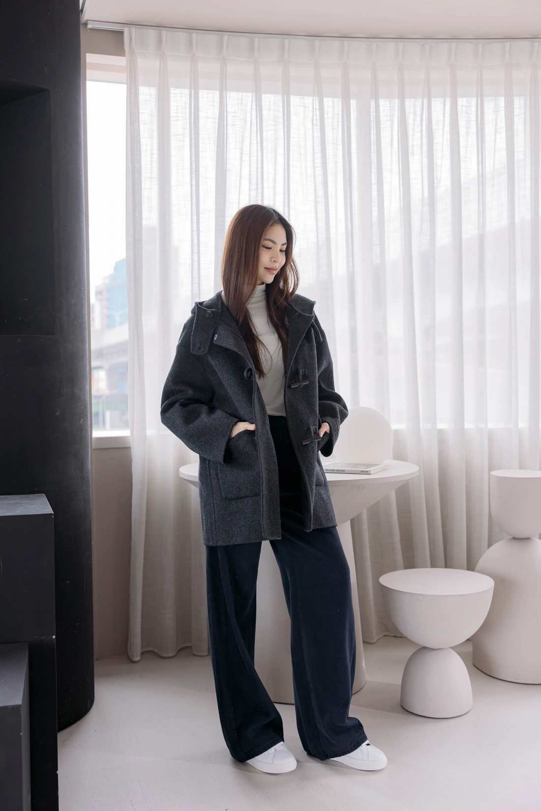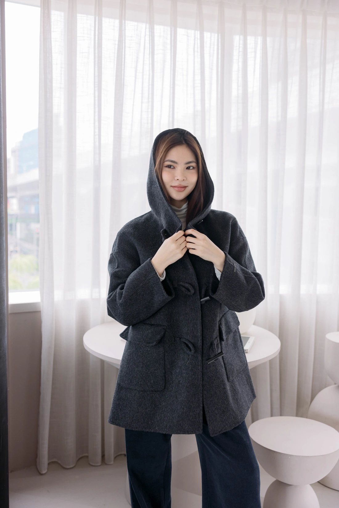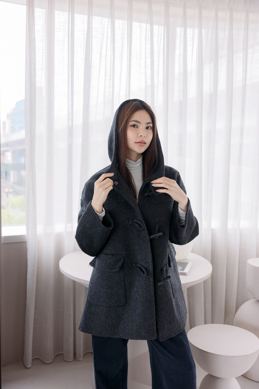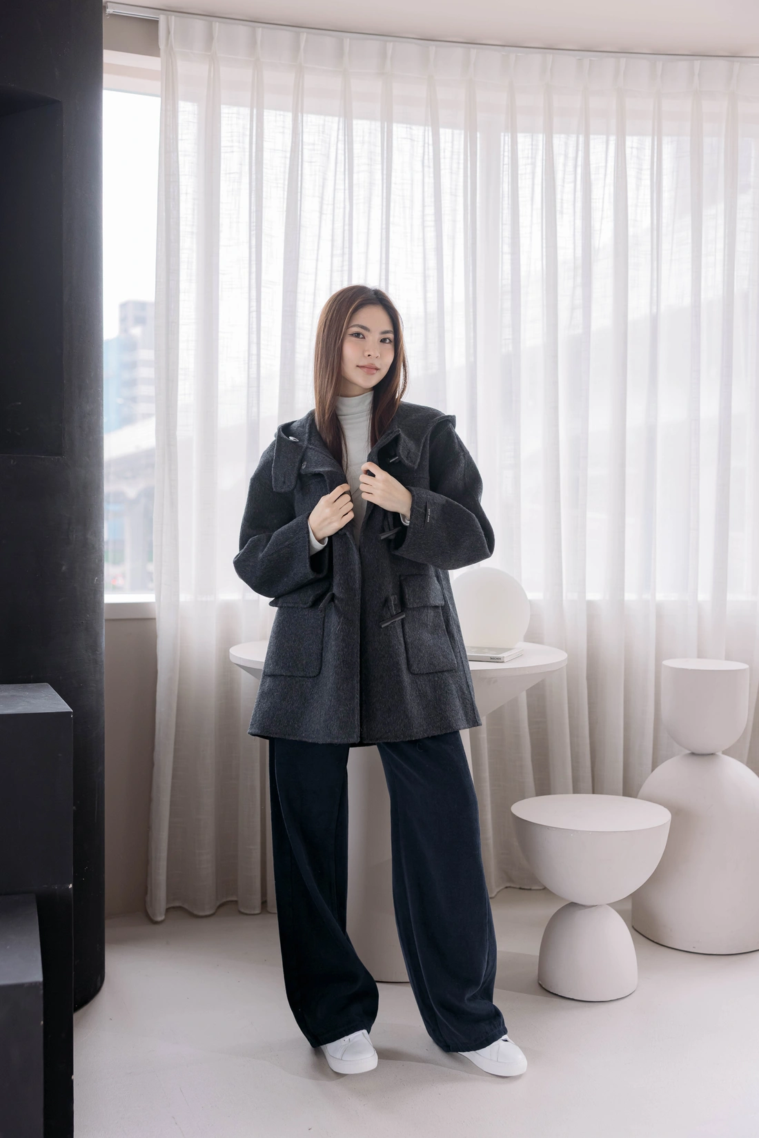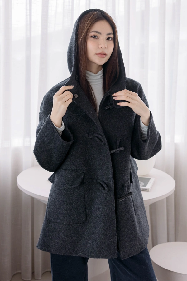 牛角釦設計外套/保暖羊毛材質/連帽設計外套