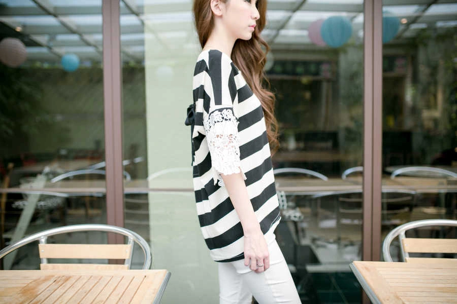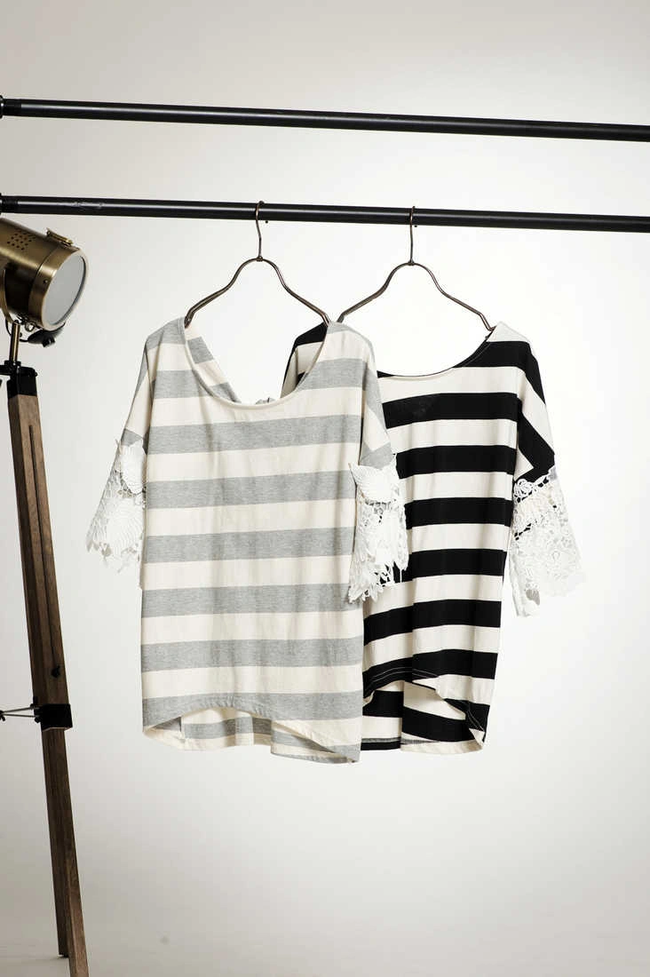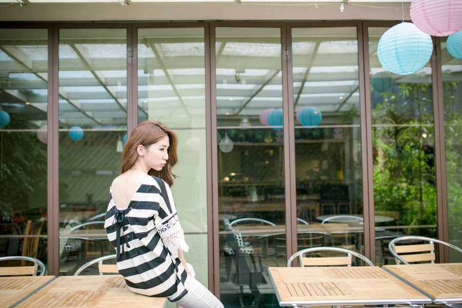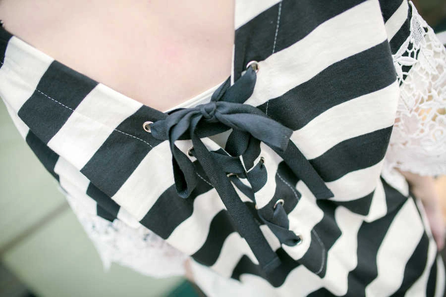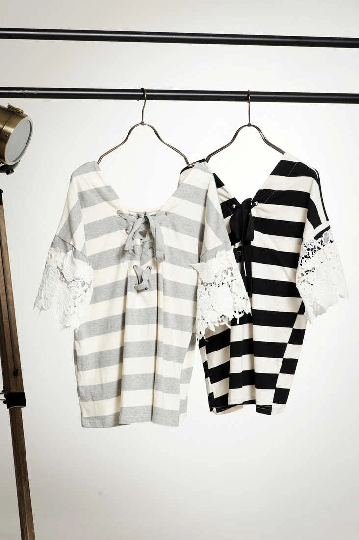 TIP:蕾絲袖、後綁帶(可拆式)、斜橫紋設計