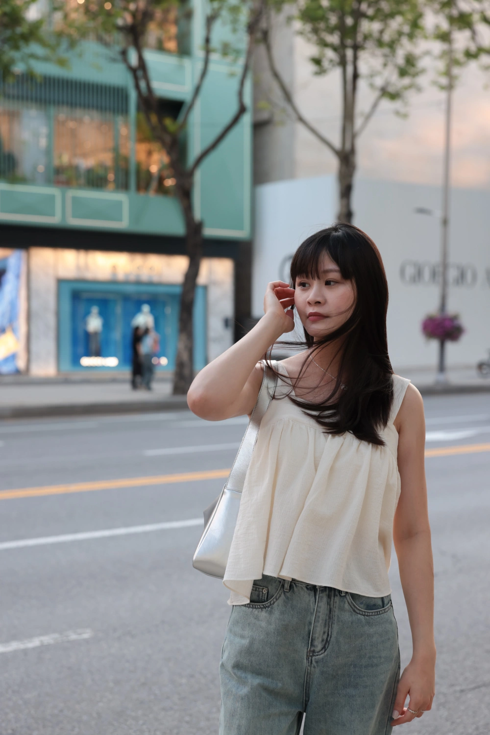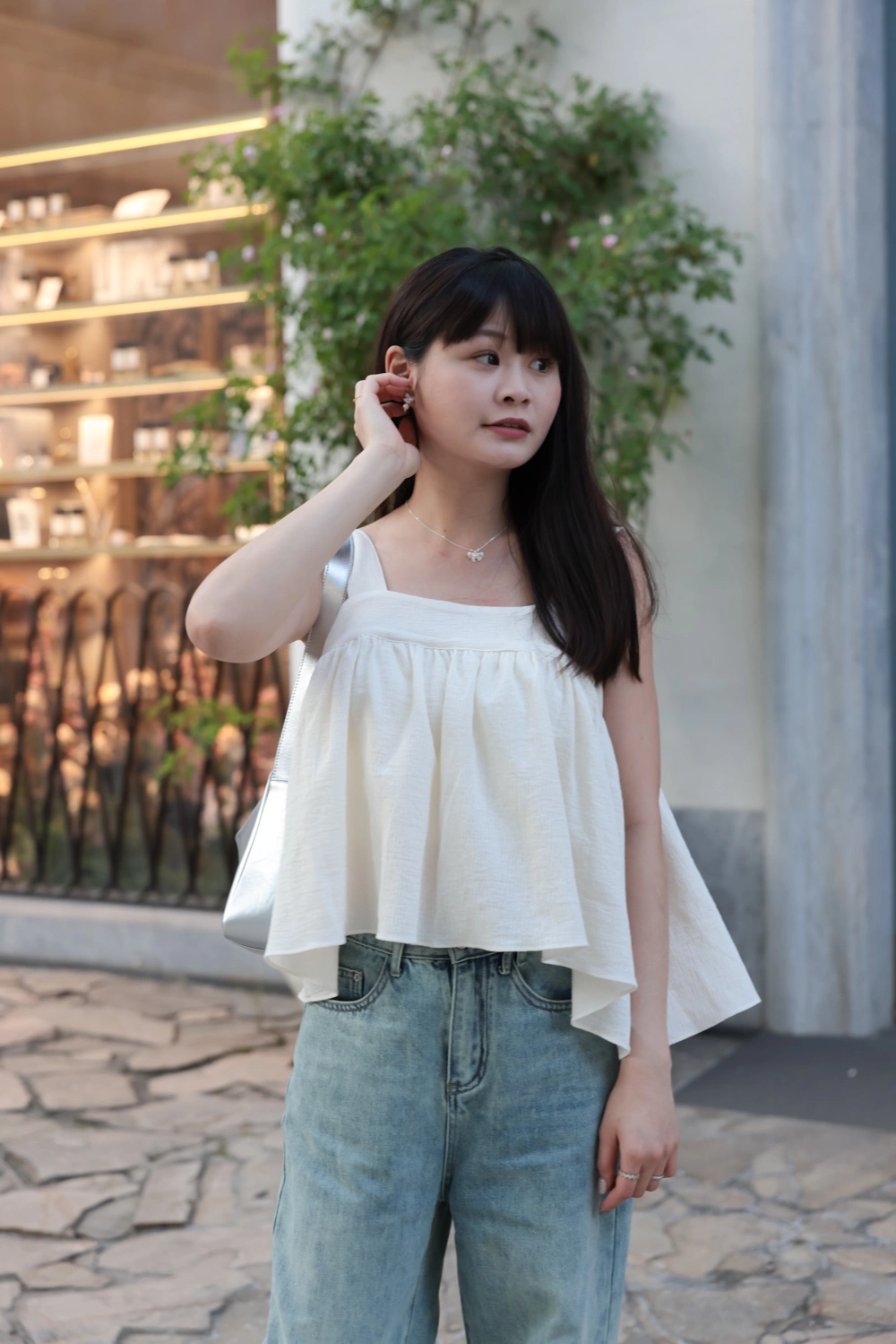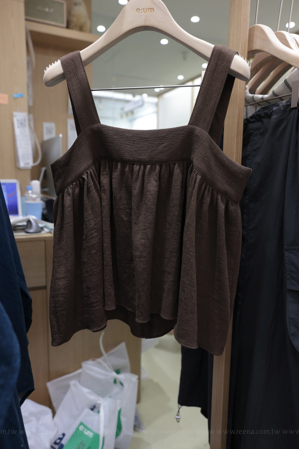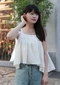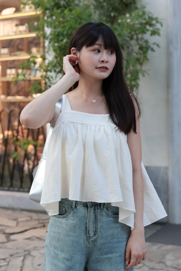 寬肩設計背心/抓皺感設計面料/後綁結細節設計