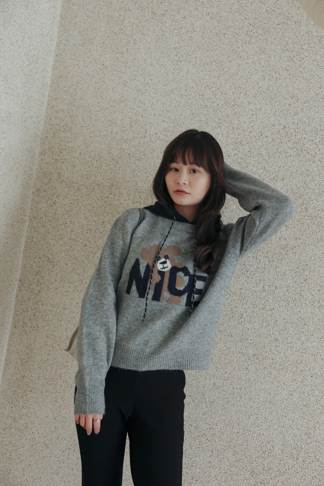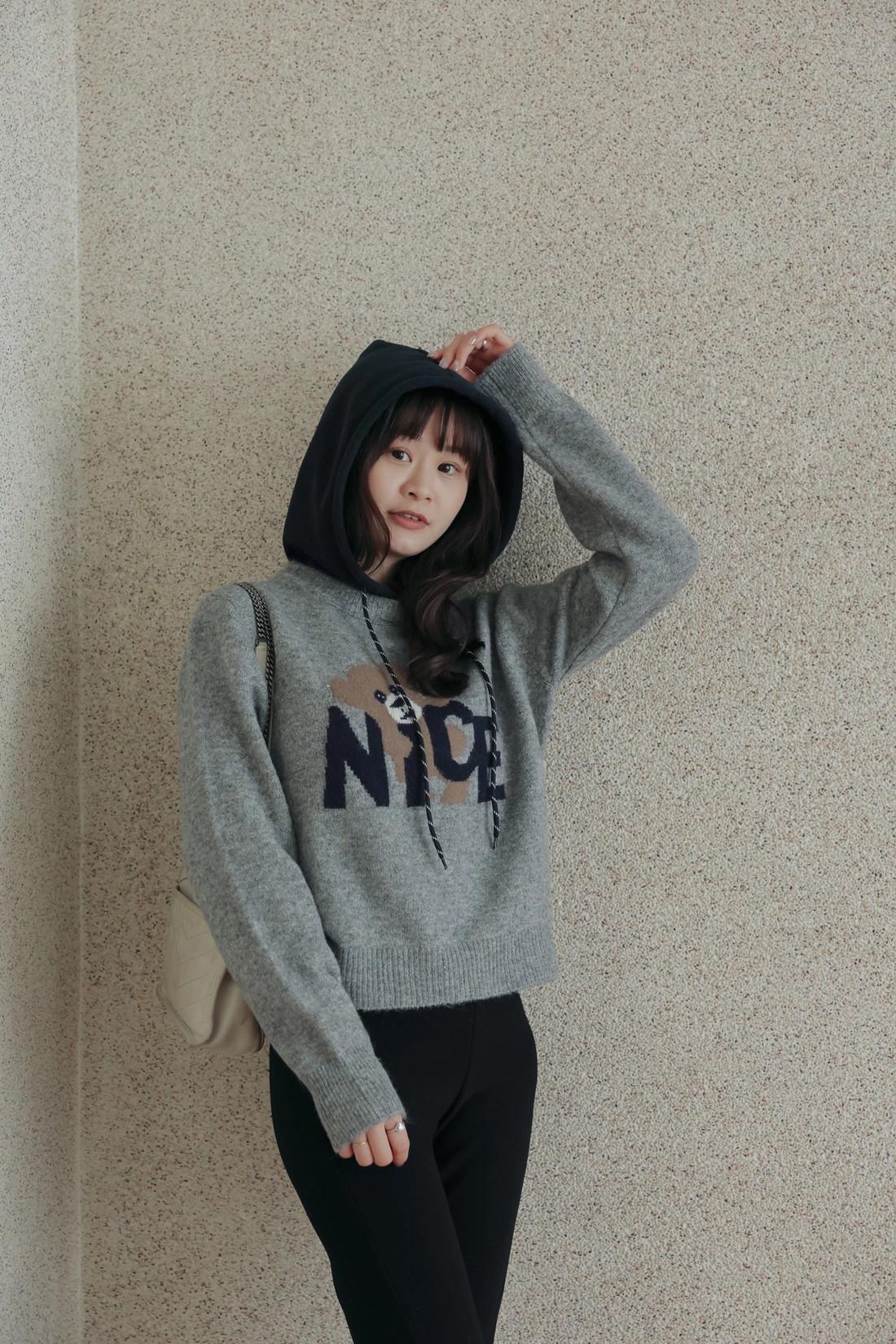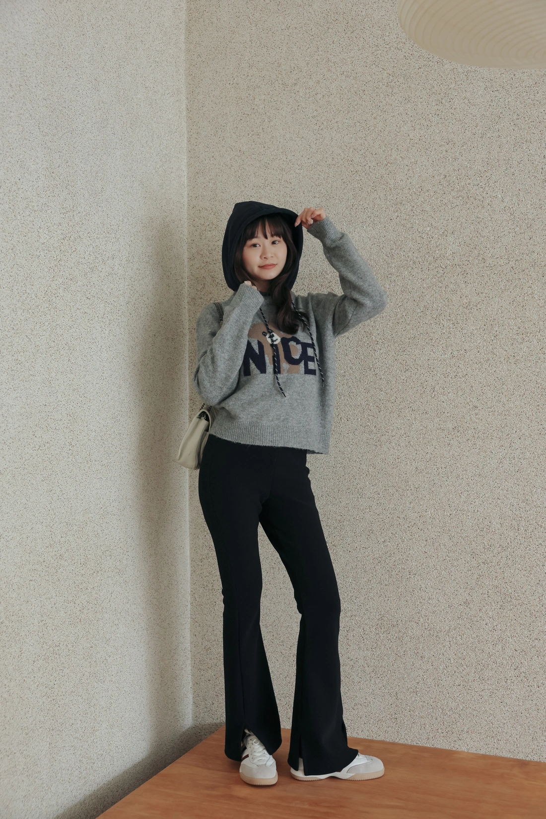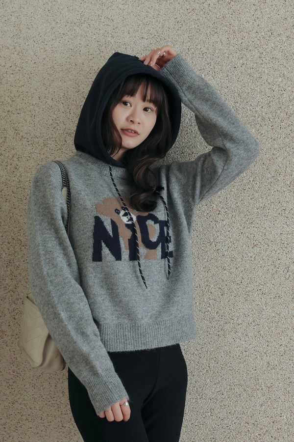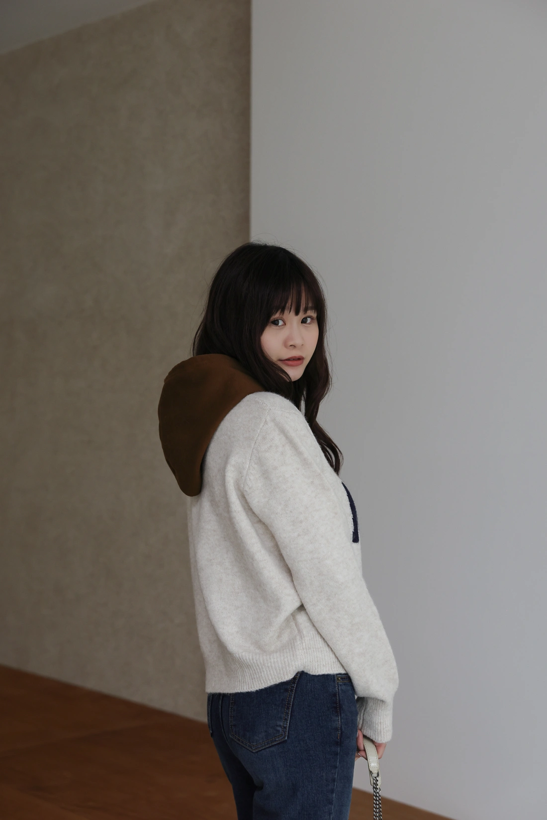 舒適針織材質/同色綁帶設計/拼接設計連帽毛衣