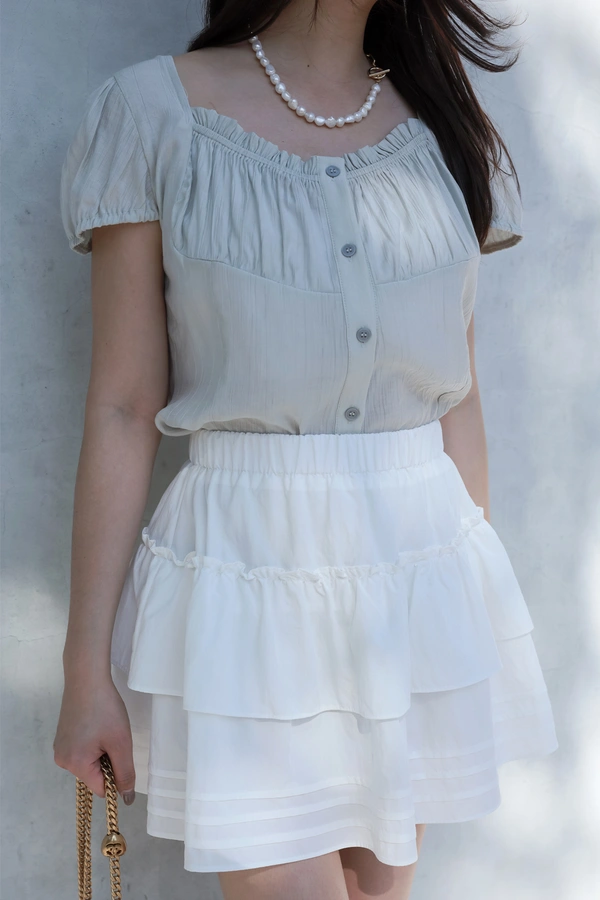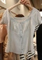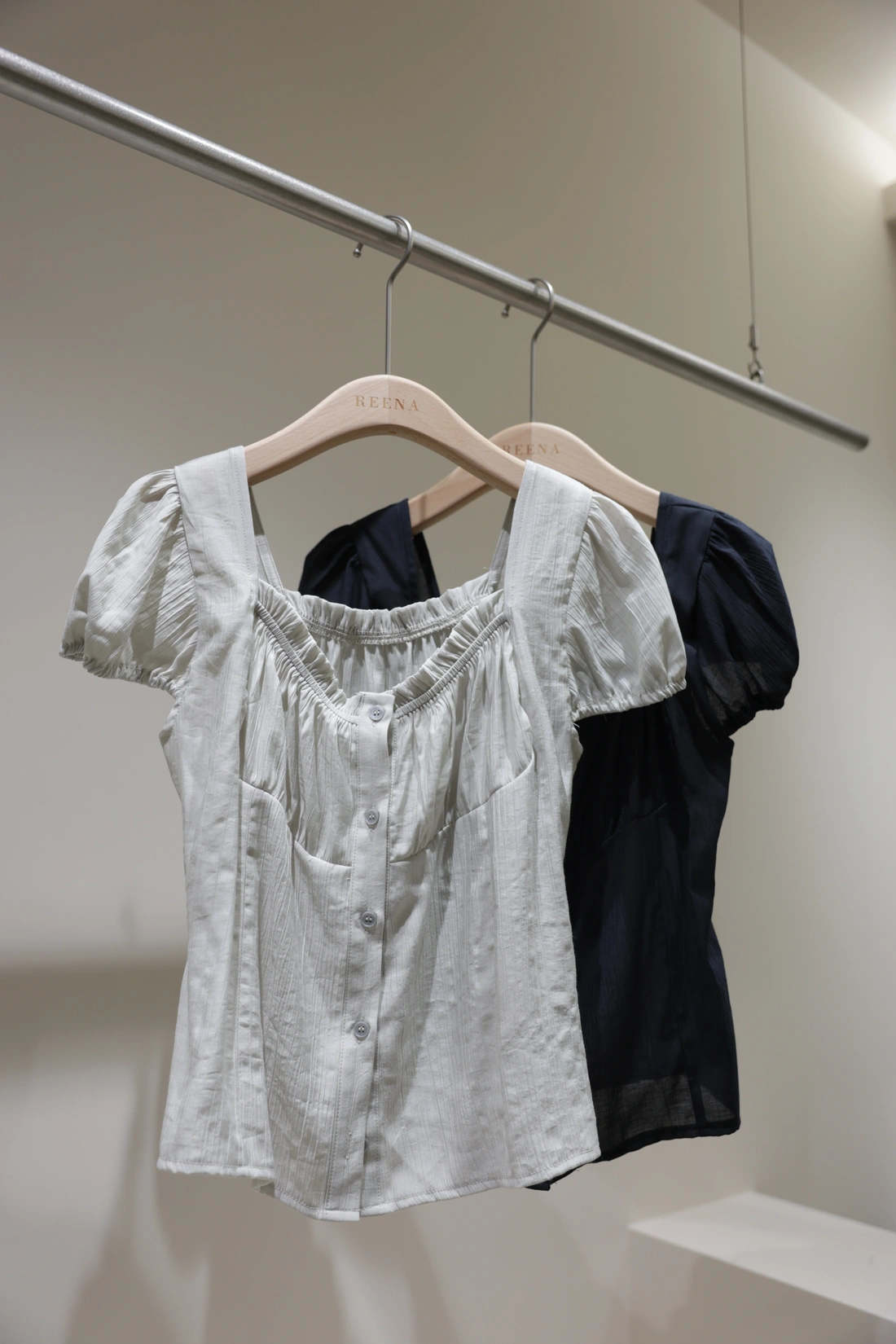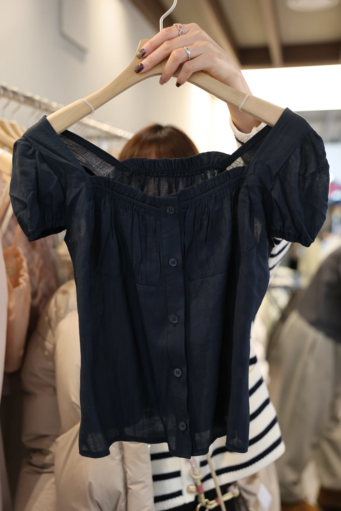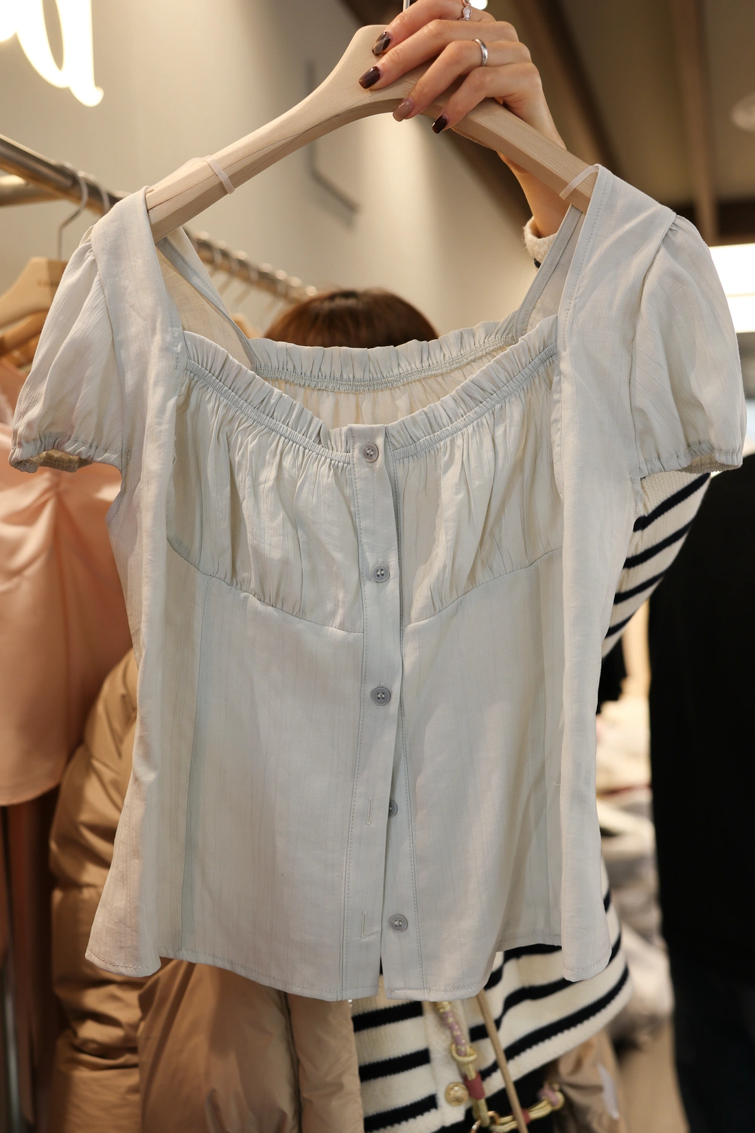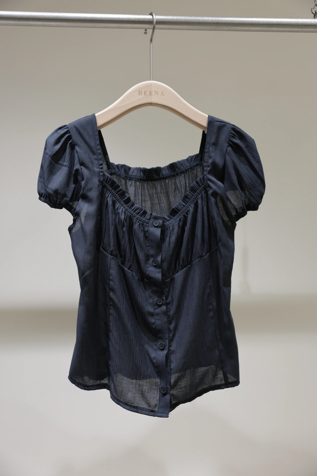法式風格甜美上衣/方領排釦設計/透膚材質超舒服