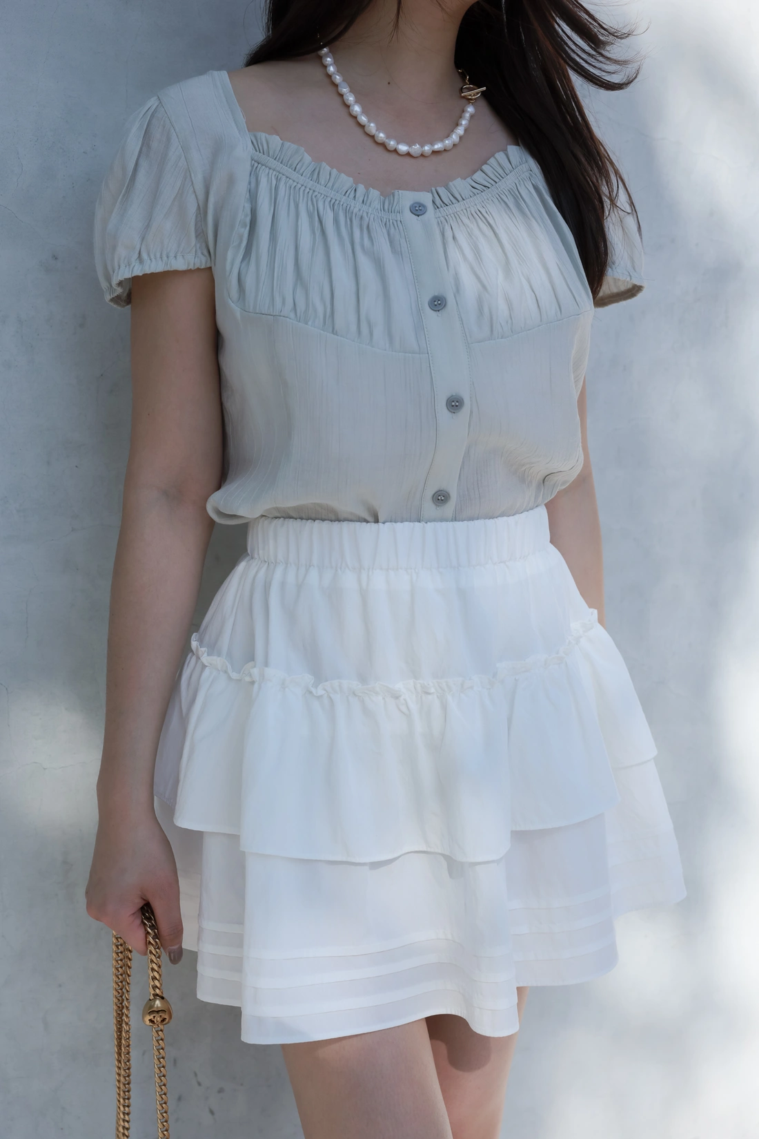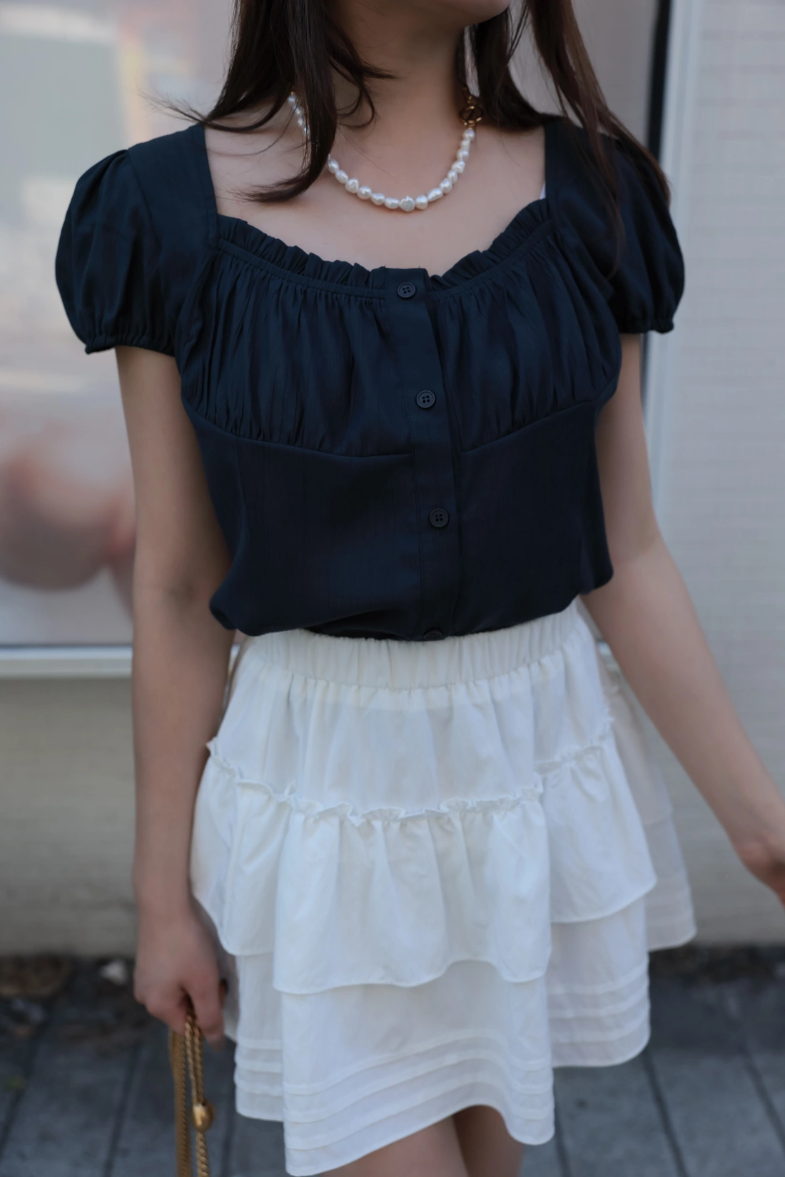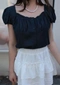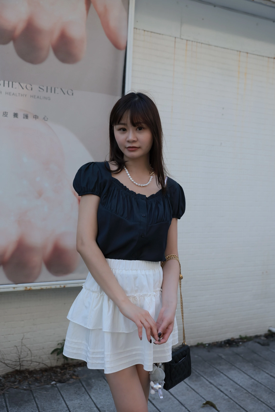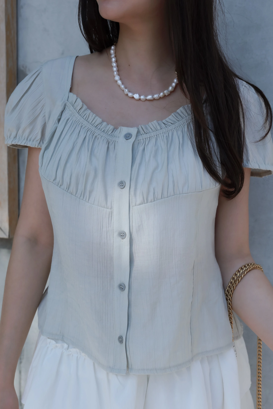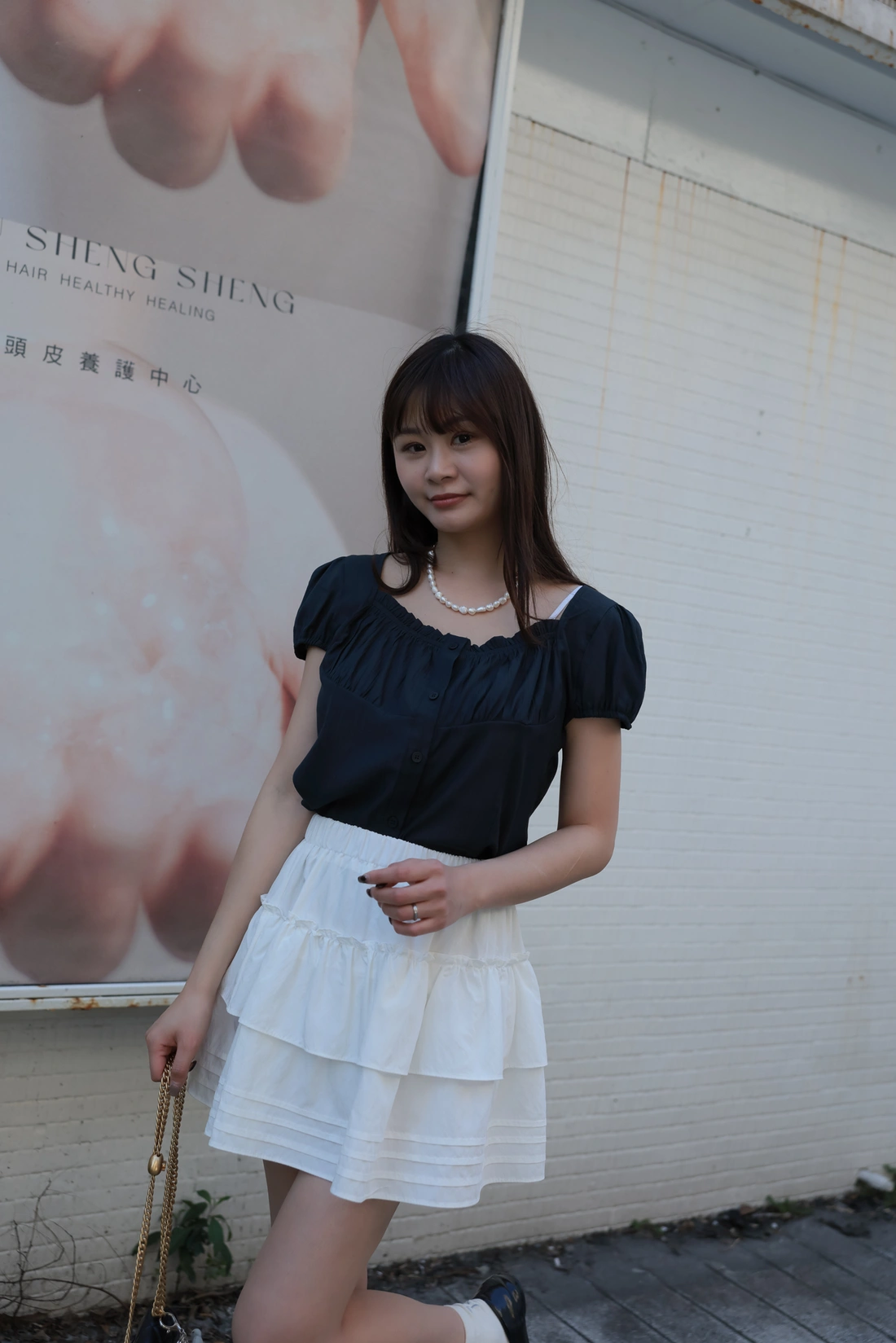 法式風格甜美上衣/方領排釦設計/透膚材質超舒服
