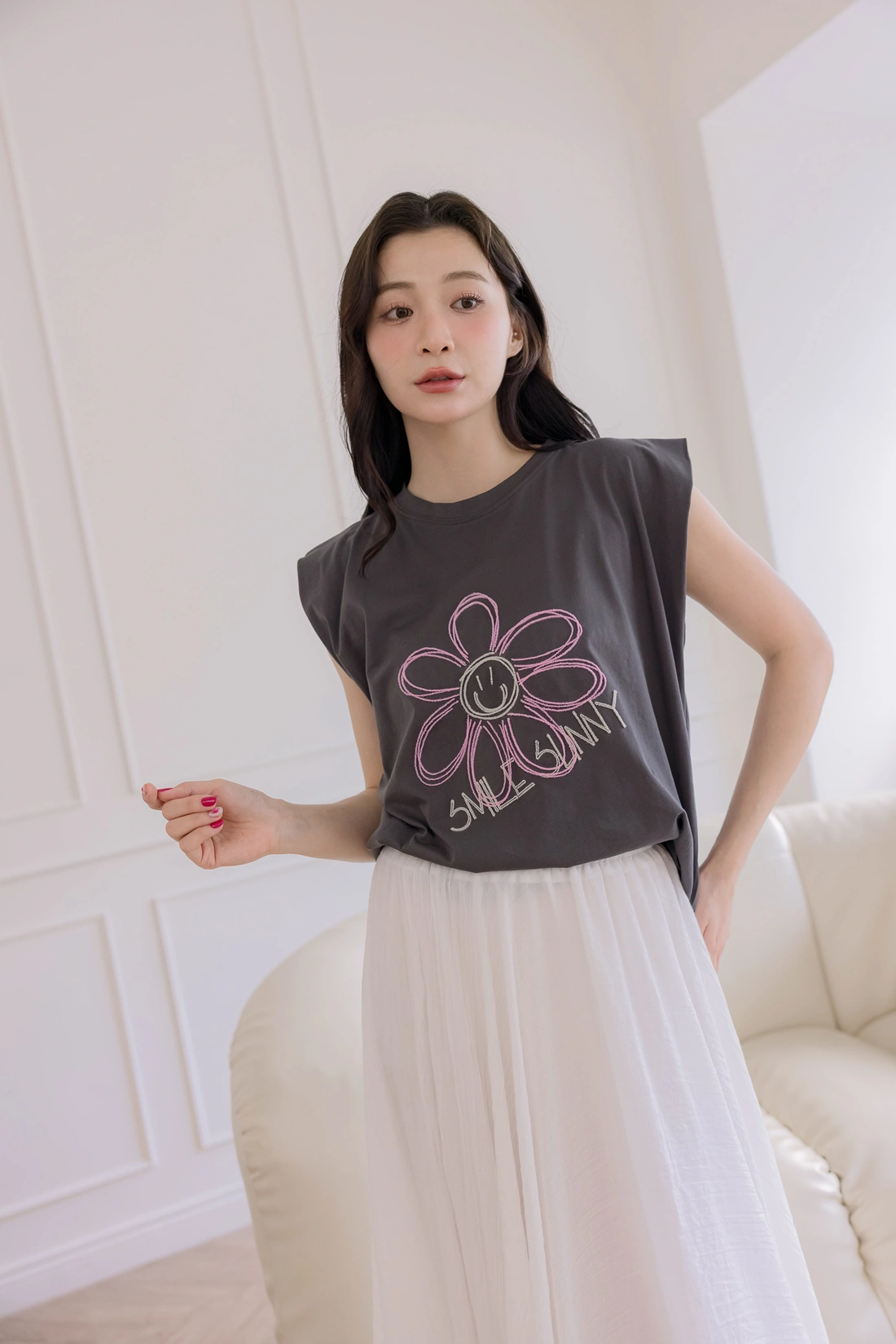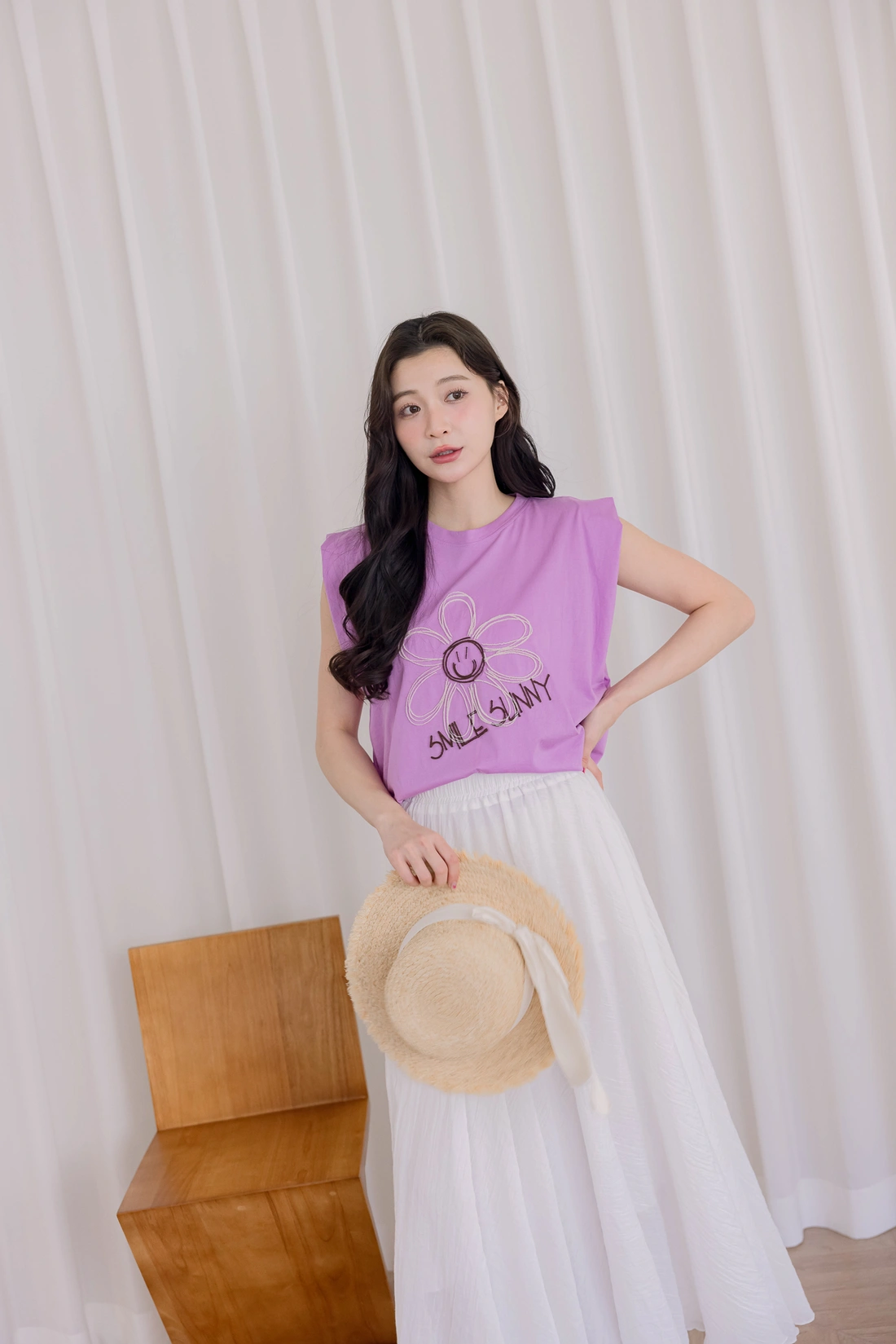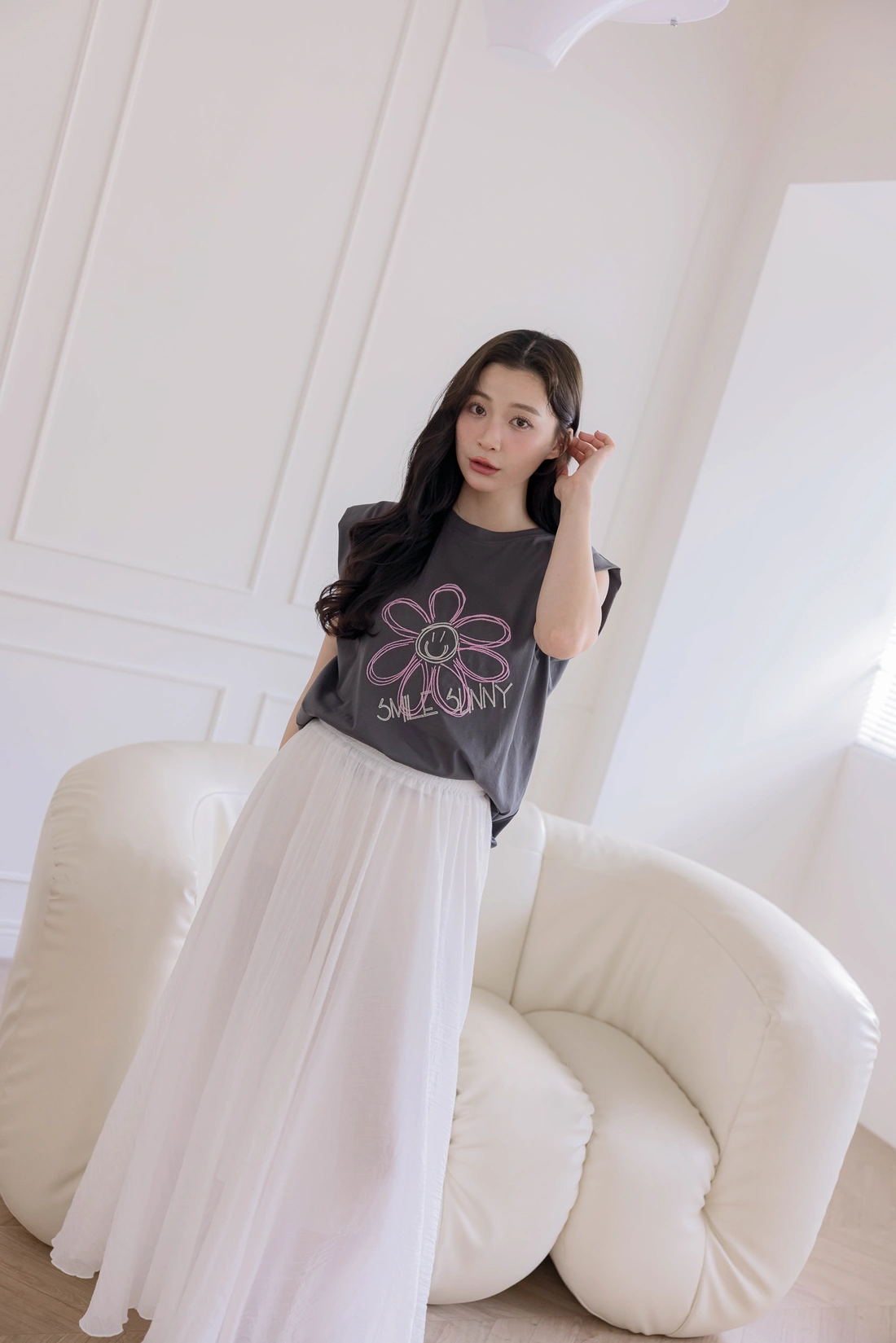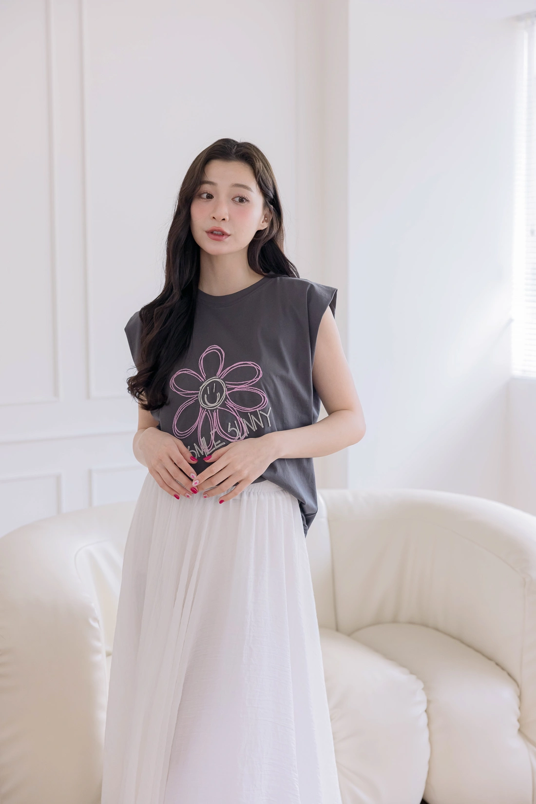 舒適棉質材質/正面刺有立體花花文字布料/落肩個性版型