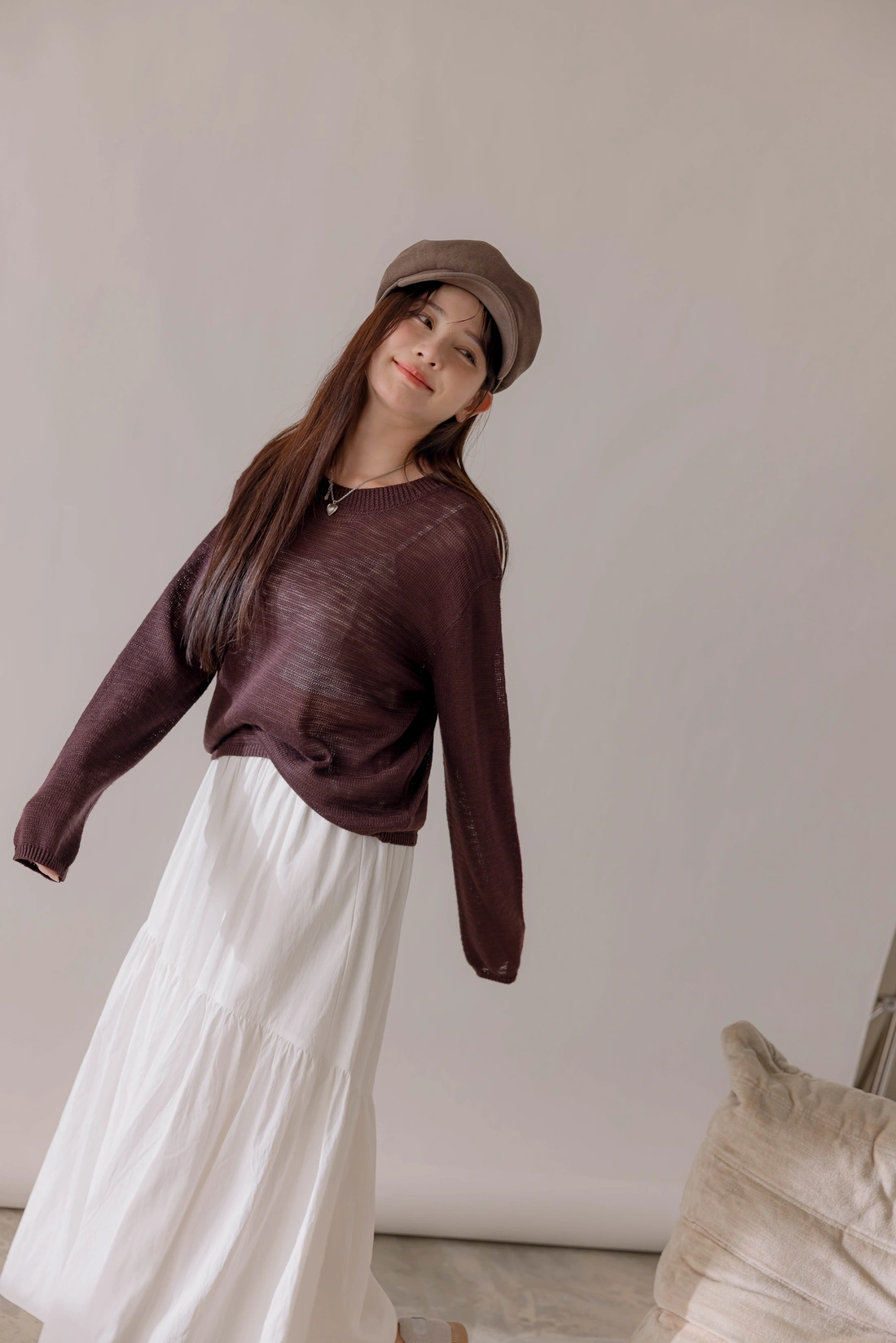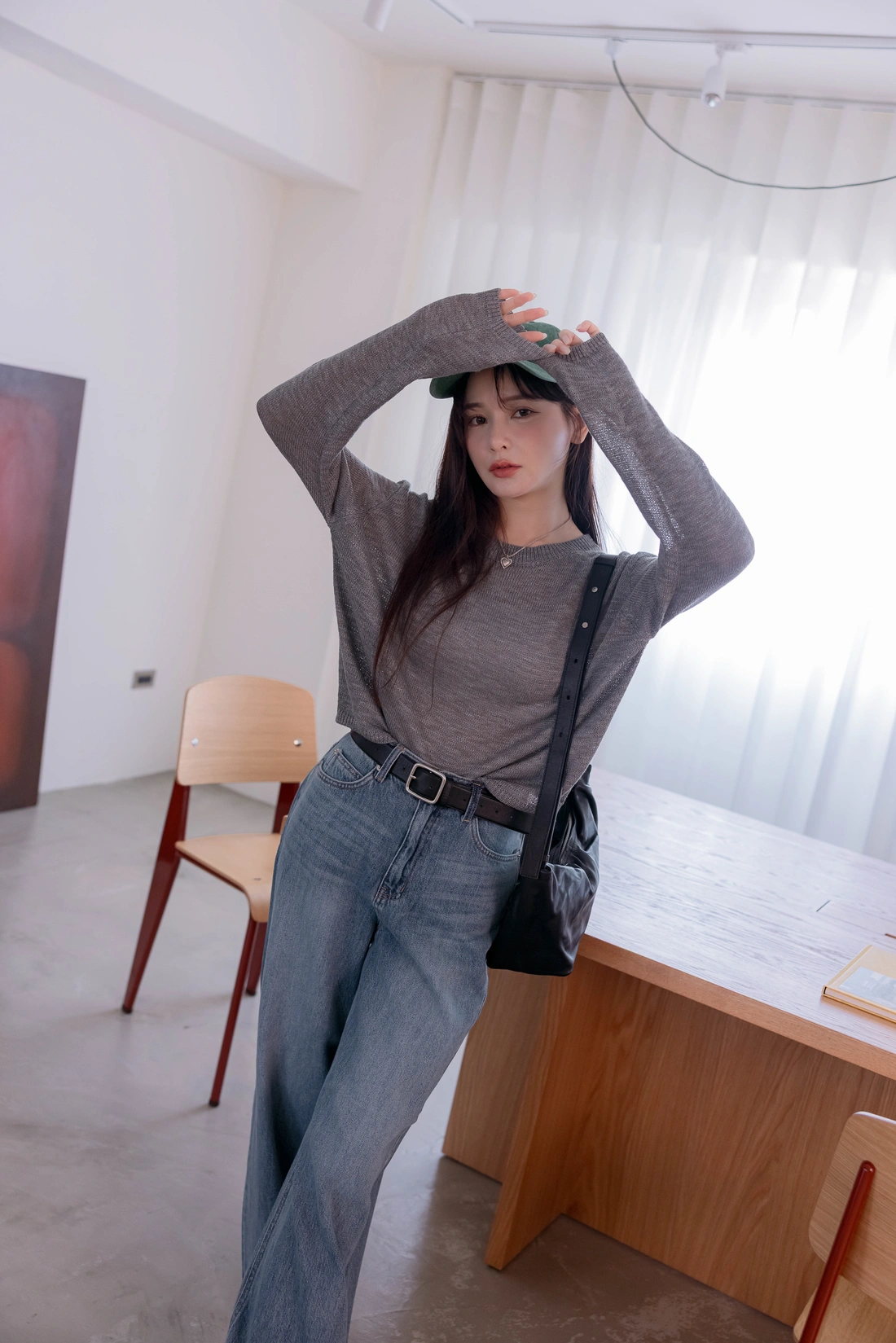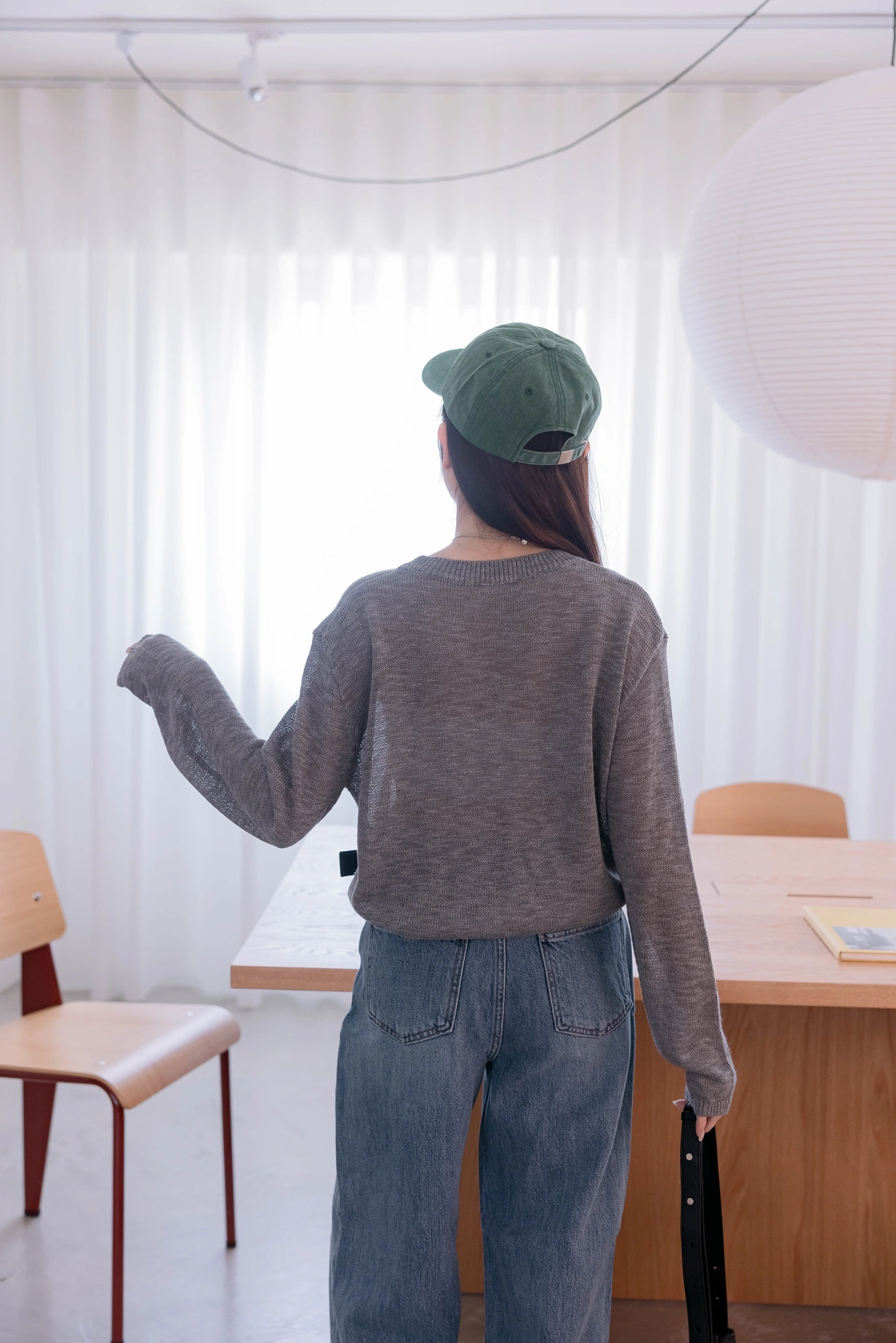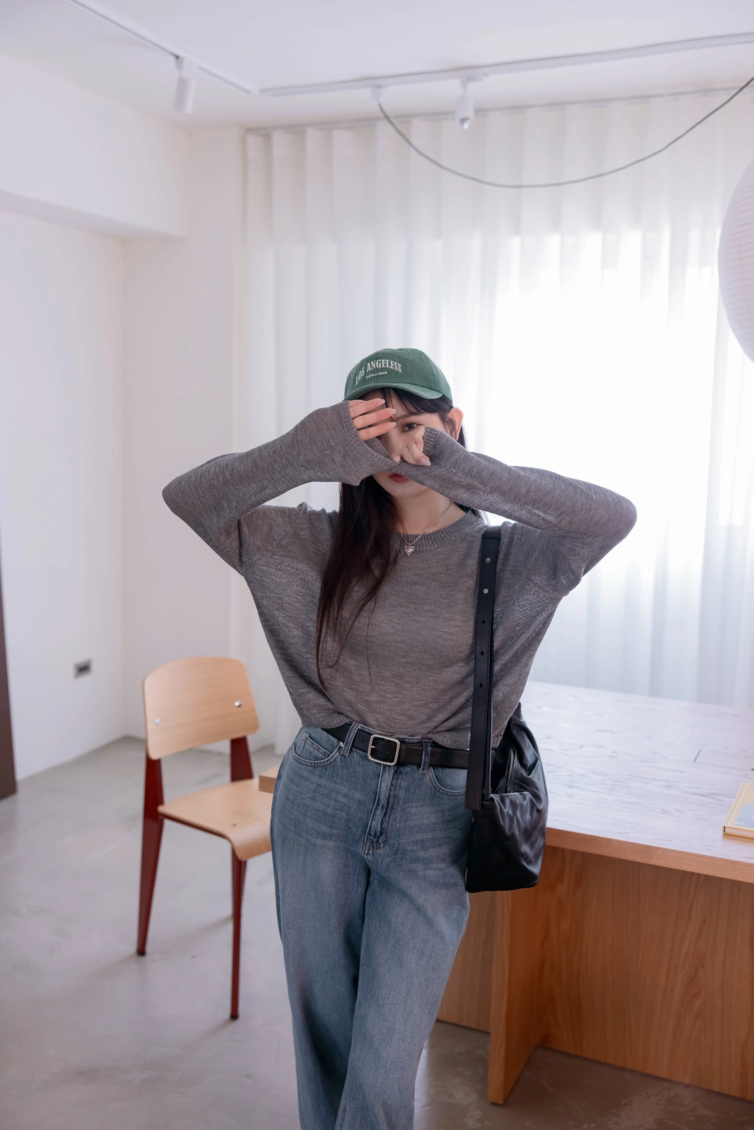 圓領設計寬鬆上衣/簍空布料設計/微透膚針織上衣