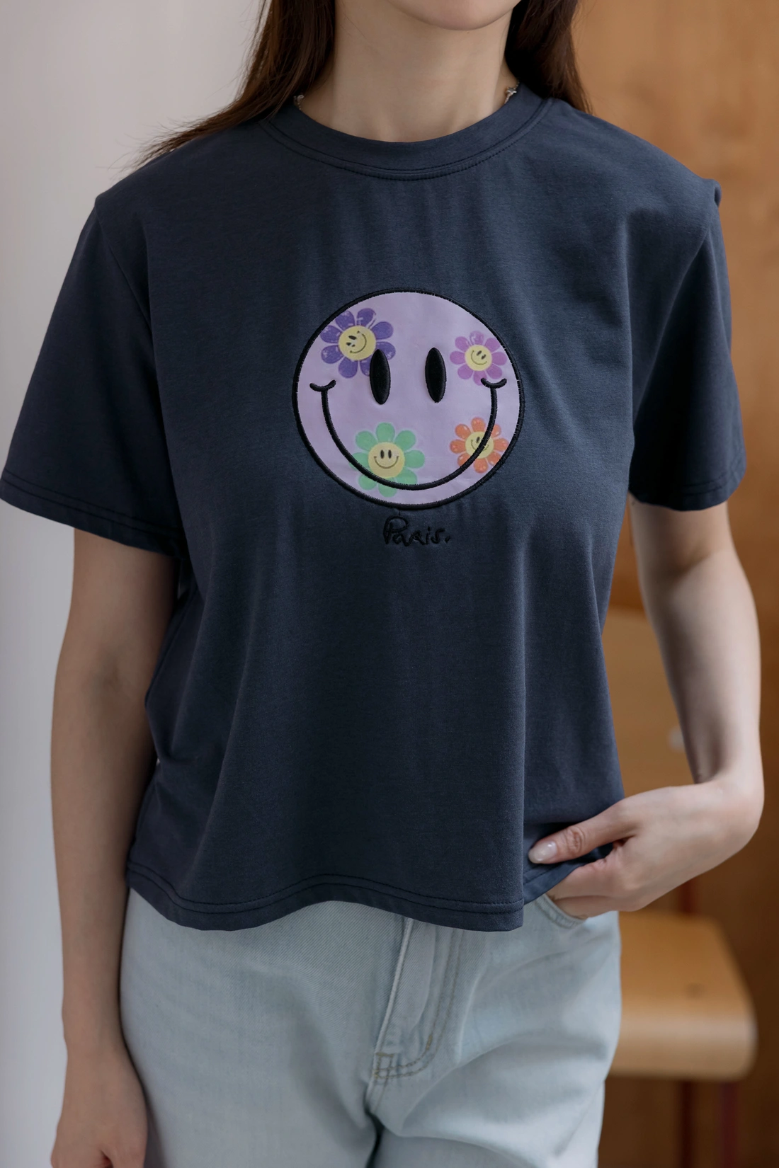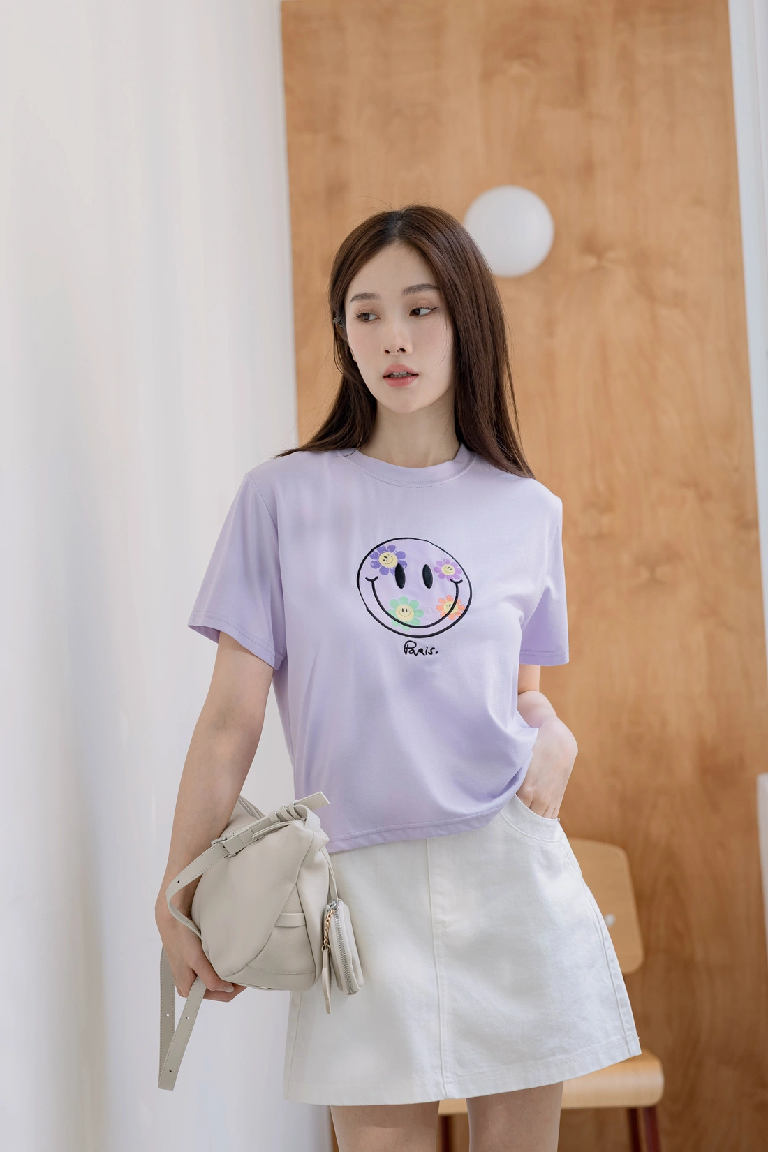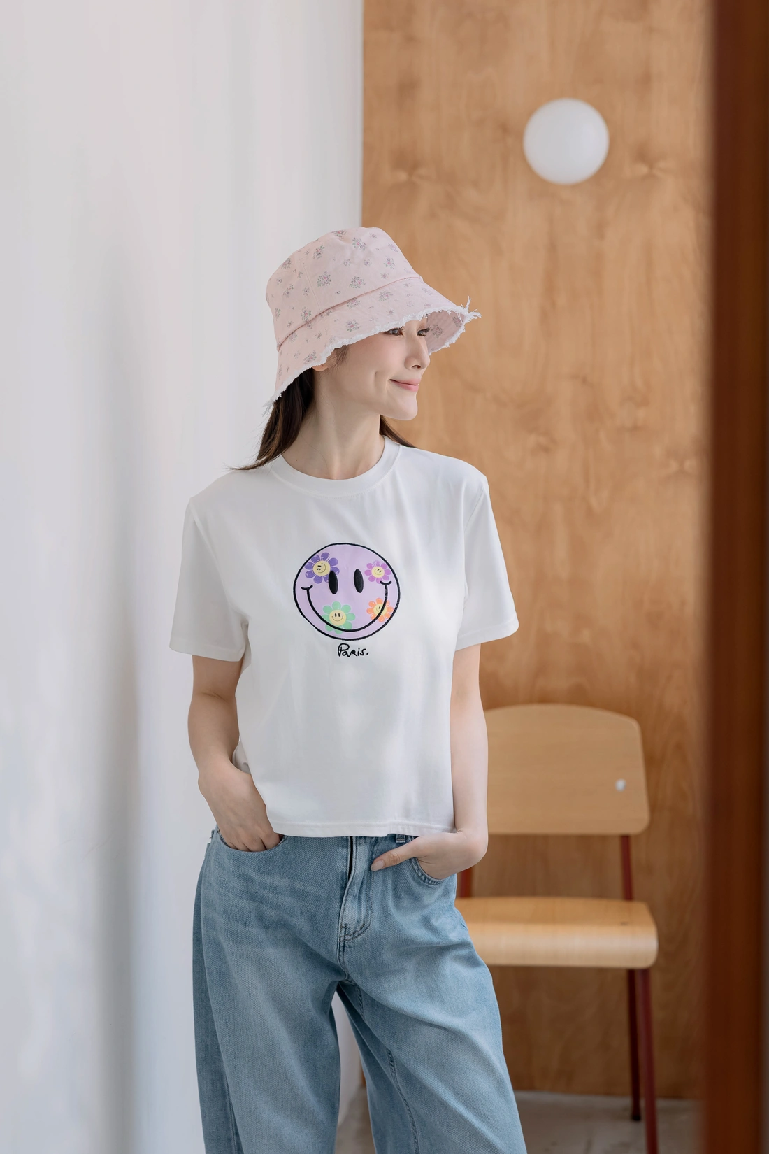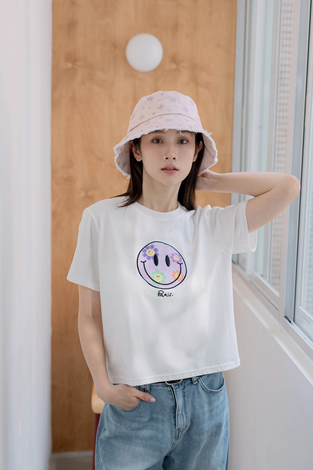 刺繡笑臉印花設計/領口微加粗不擔心荷葉領