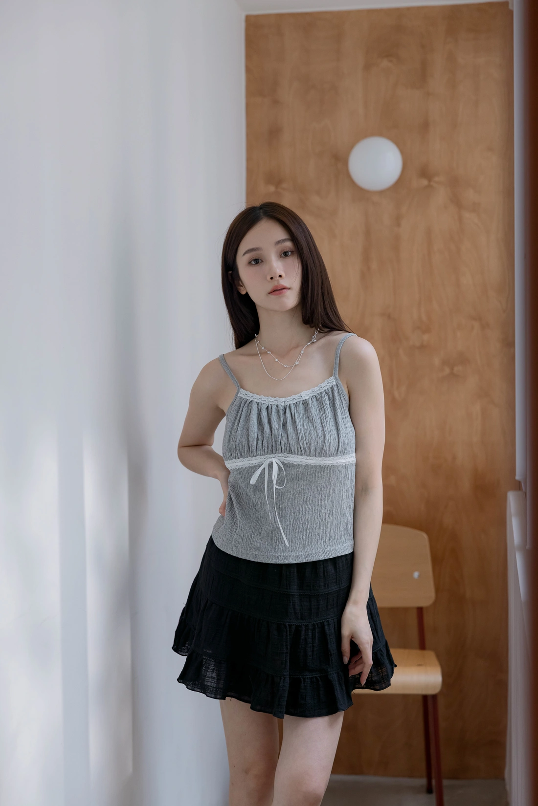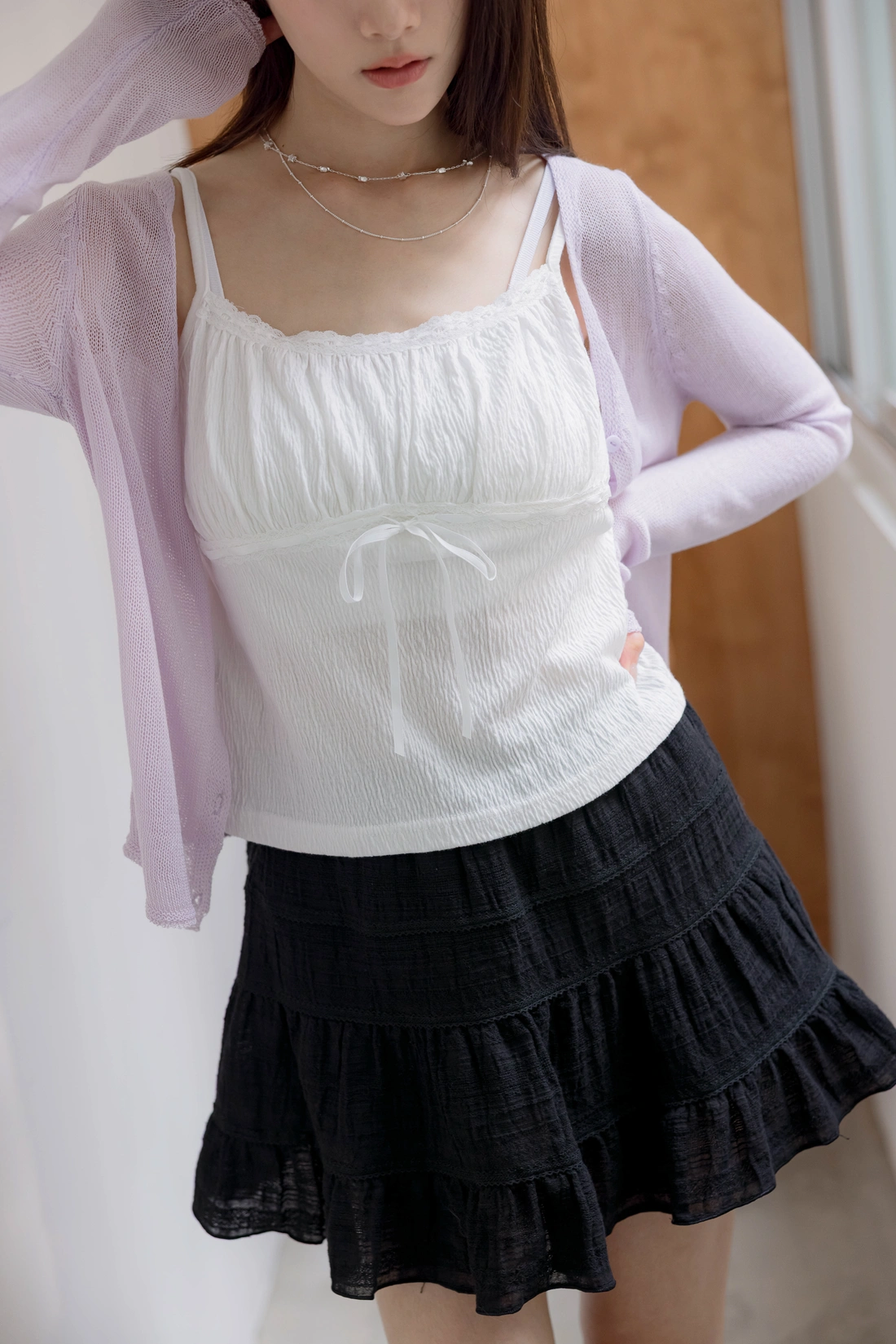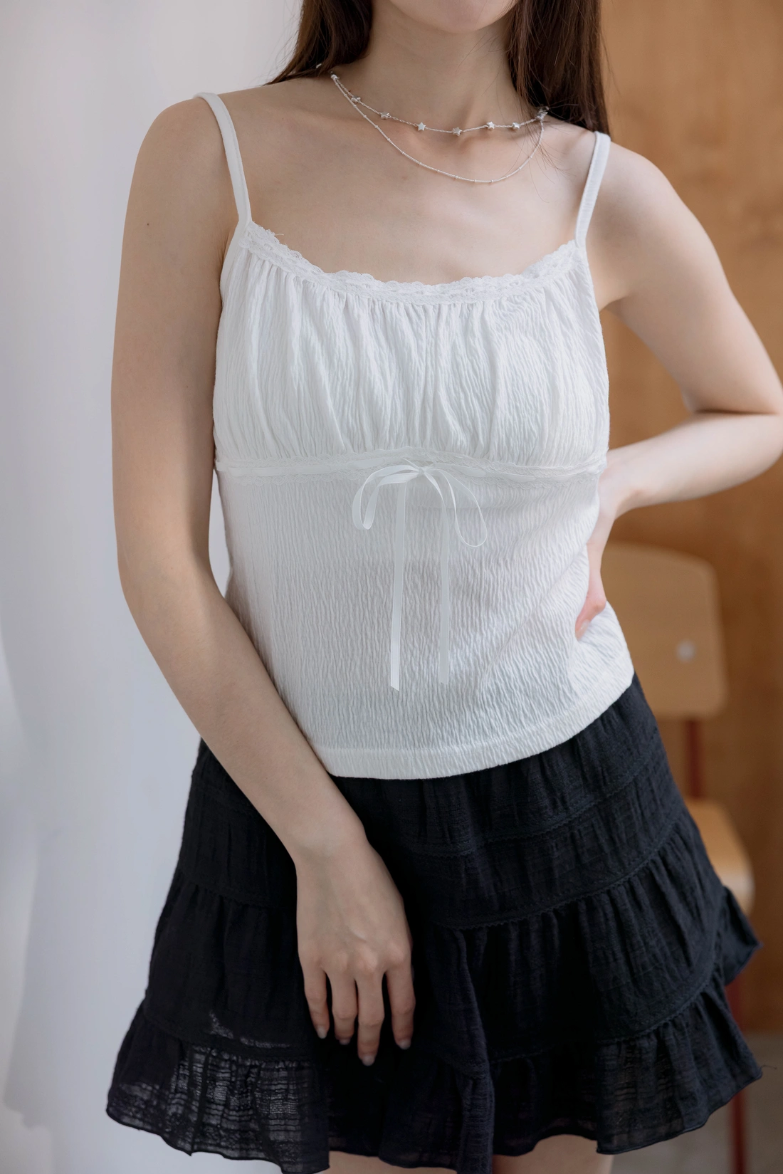 布料本身皺感可愛感加分/正面拼接花邊蝴蝶結設計