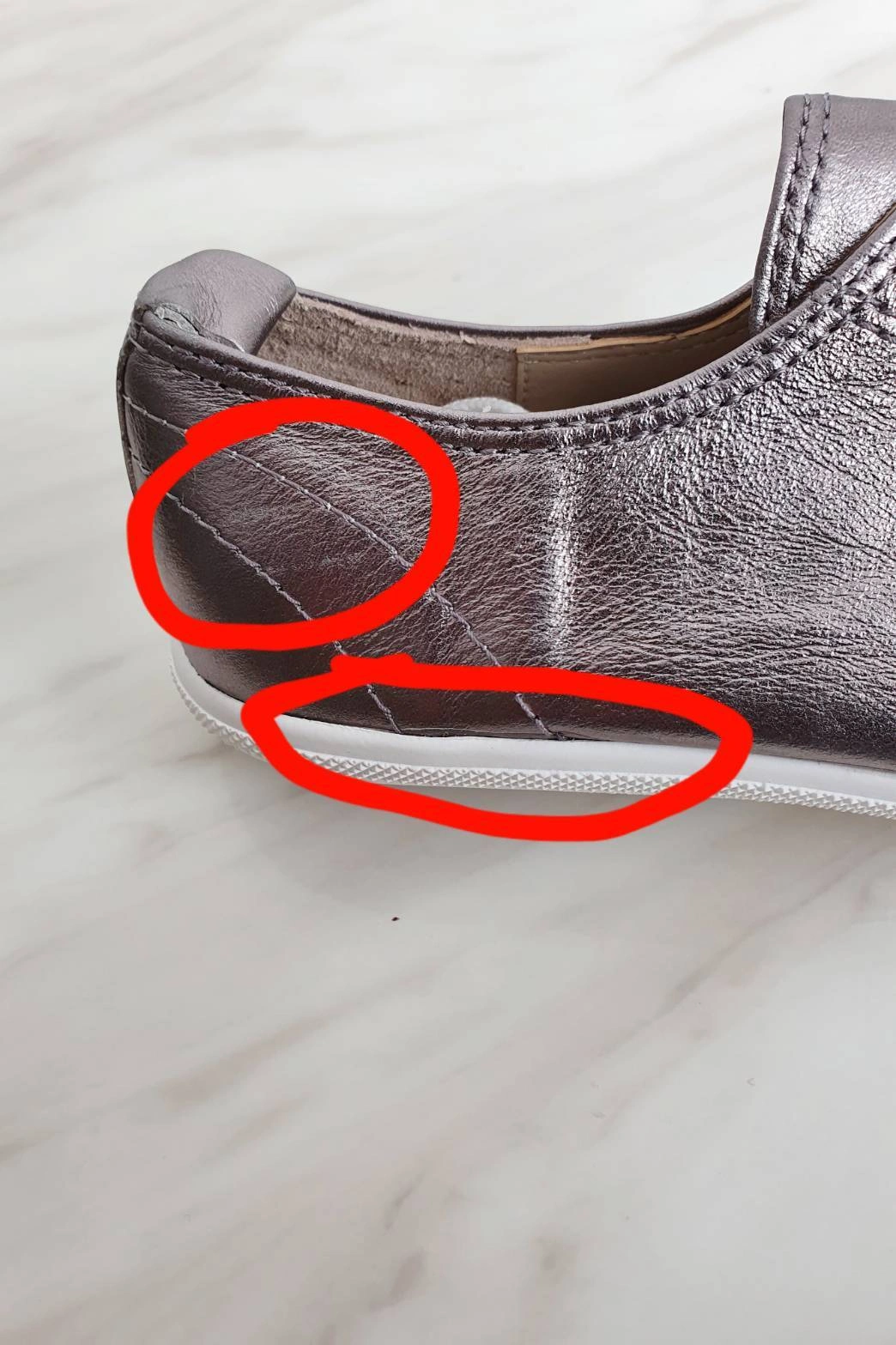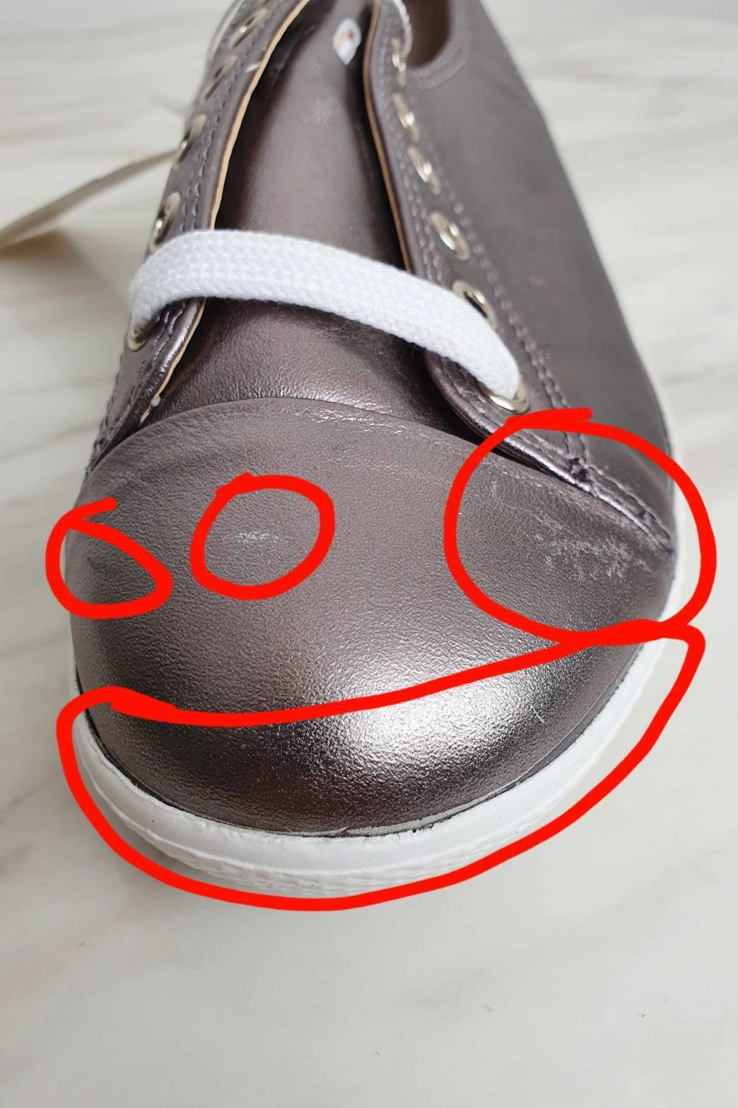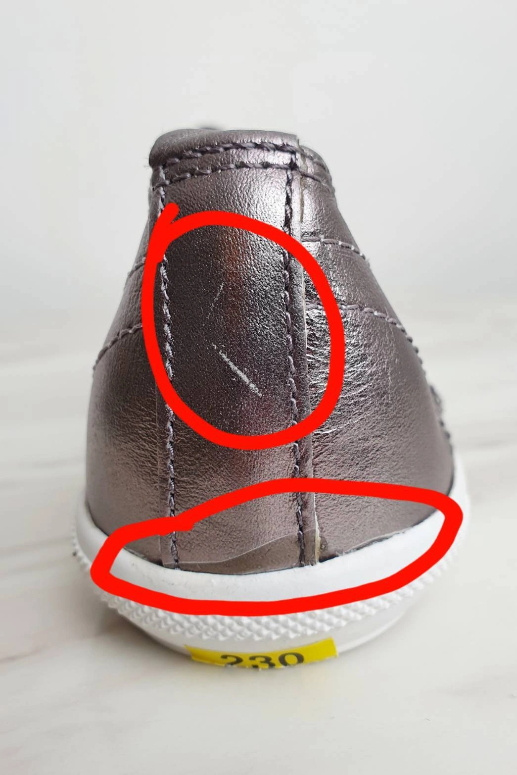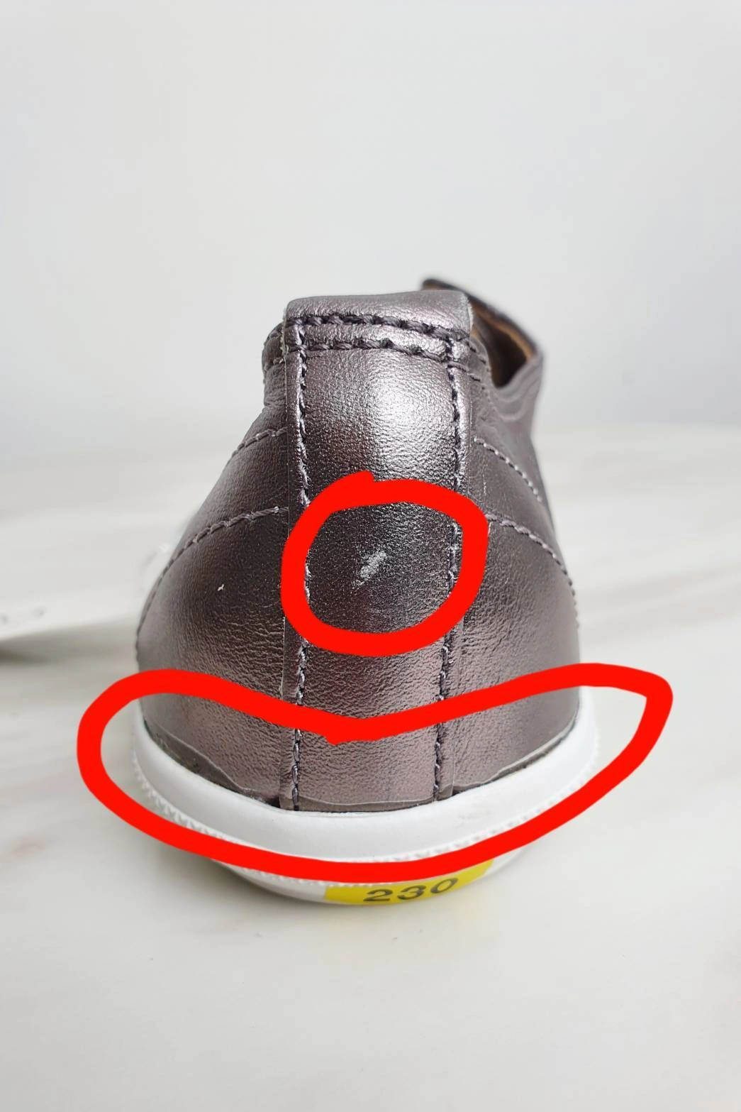 此件為韓國全新品到貨檢查出瑕疵為左右腳多處鞋底接縫處皮裂,多處掉色,