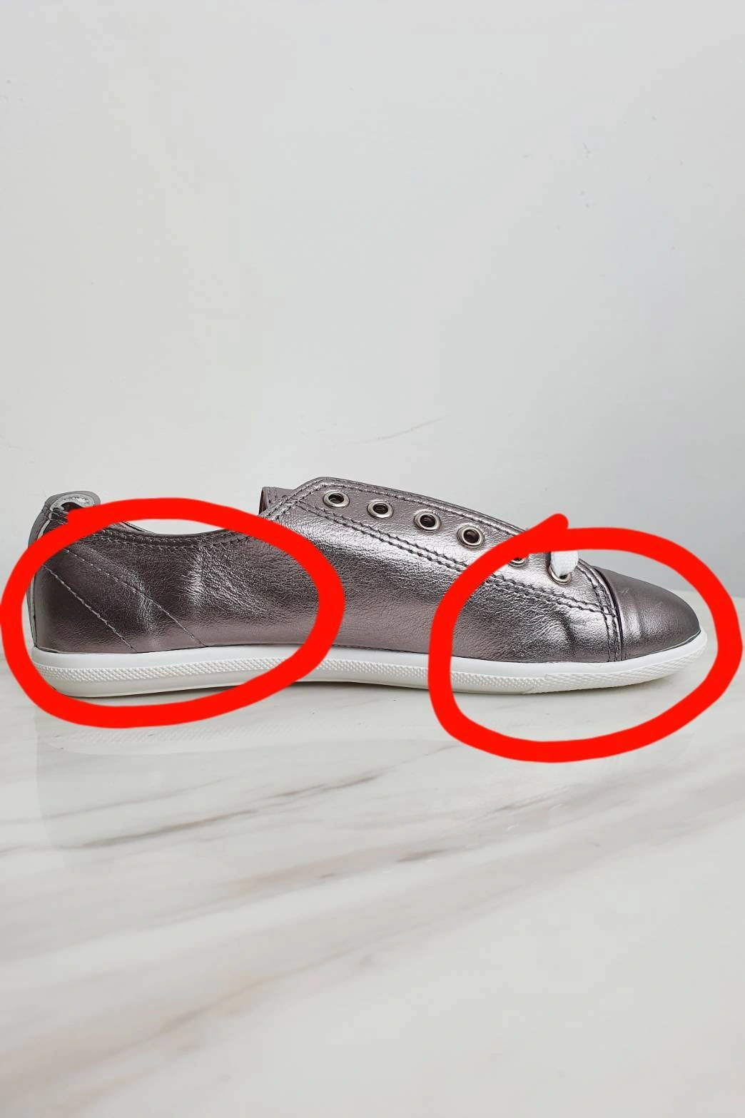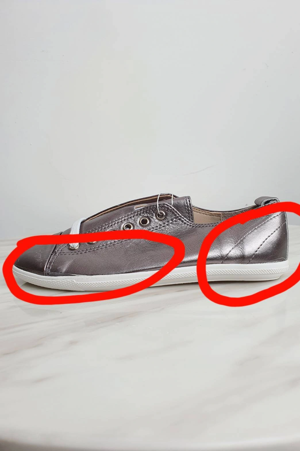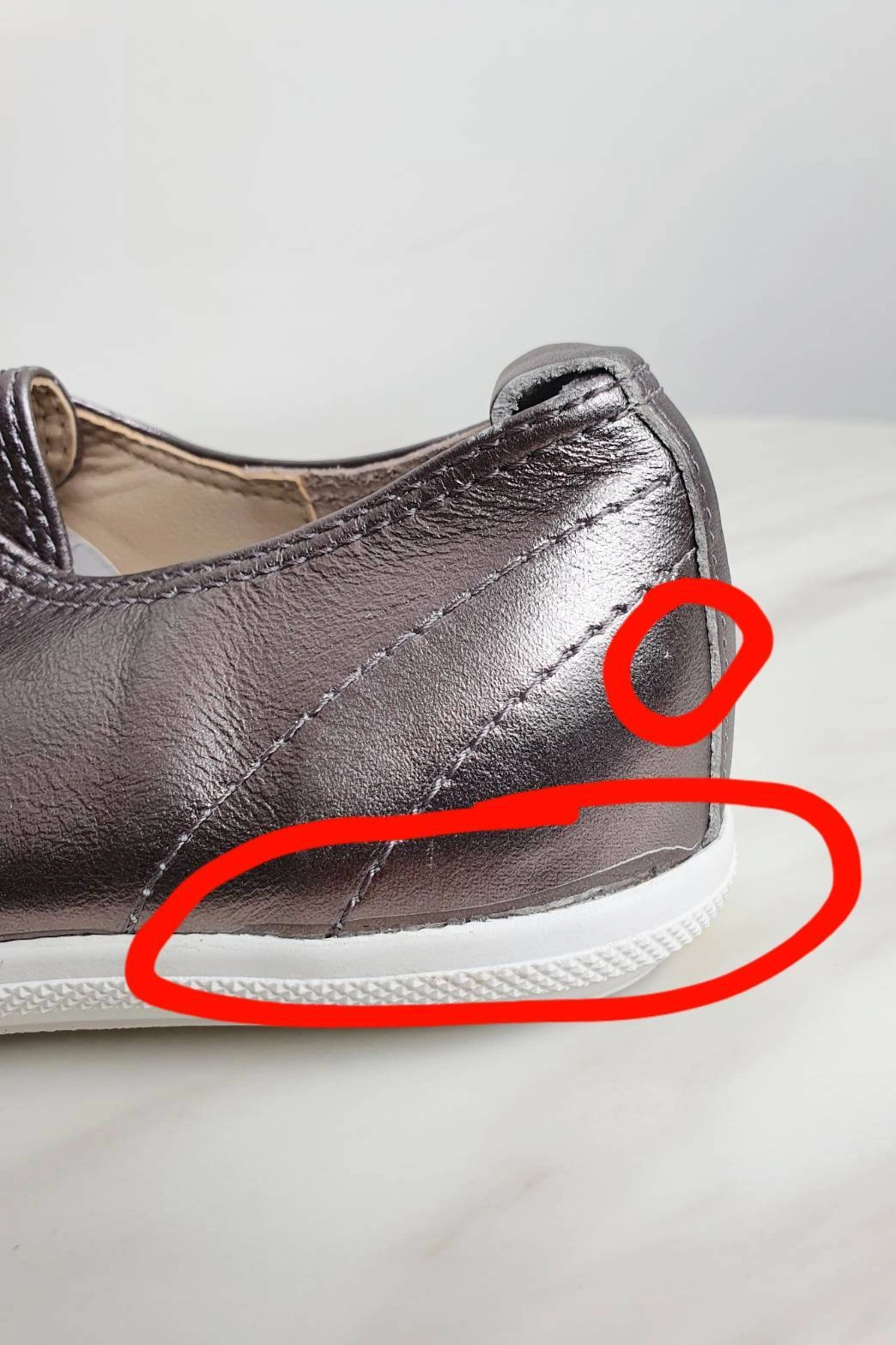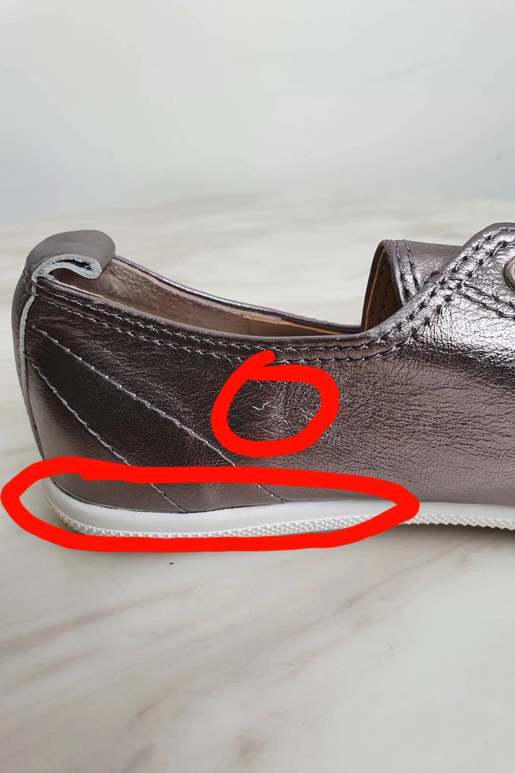 此件為韓國全新品到貨檢查出瑕疵為左右腳多處鞋底接縫處皮裂,多處掉色,